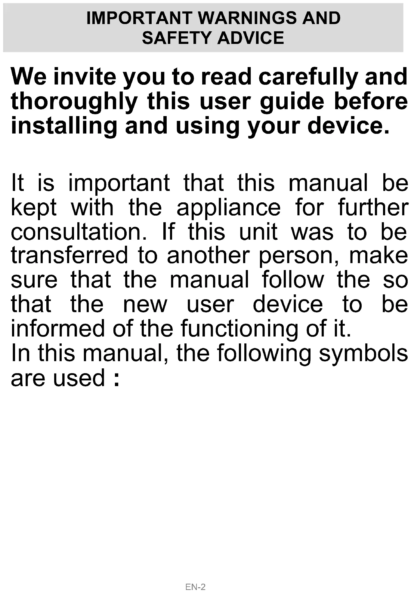garantie sera annulée en cas d'élimination de la plaque signalétique et/ou du numéro de série du produit. Continental Edison – 120-126 Quai de Bacalan – CS 11584 – 33000 Bordeaux Importé par SCHNEIDER CONSUMER GROUP, 12, rue Jules Ferry, 93110 Rosny-sous-Bois, FRANCEEN-2 We invite you to read carefully and thoroughly this user guide before installing and using your device. It is important that this manual be kept with the appliance for further consultation. If this unit was to be transferred to another person, make sure that the manual follow the so that the new user device to be informed of the functioning of it. In this manual, the following symbols are used :