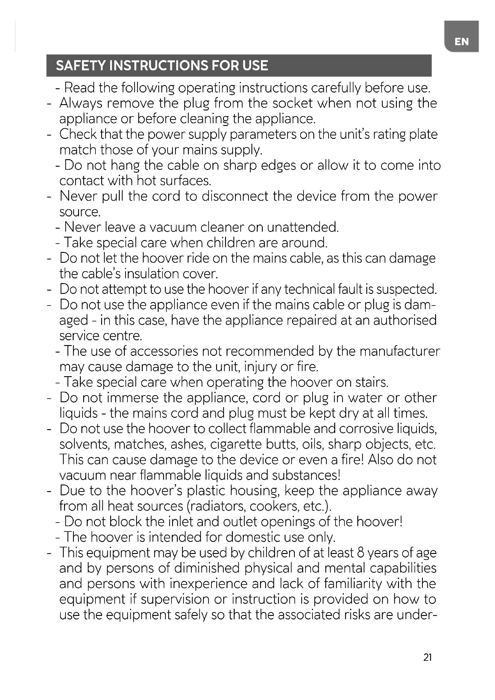 Due to the hoover’s plastic housing, keep the appliance away from all heat sources (radiators, cookers, etc.). - Do not block the inlet and outlet openings of the hoover! - The hoover is intended for domestic use only.