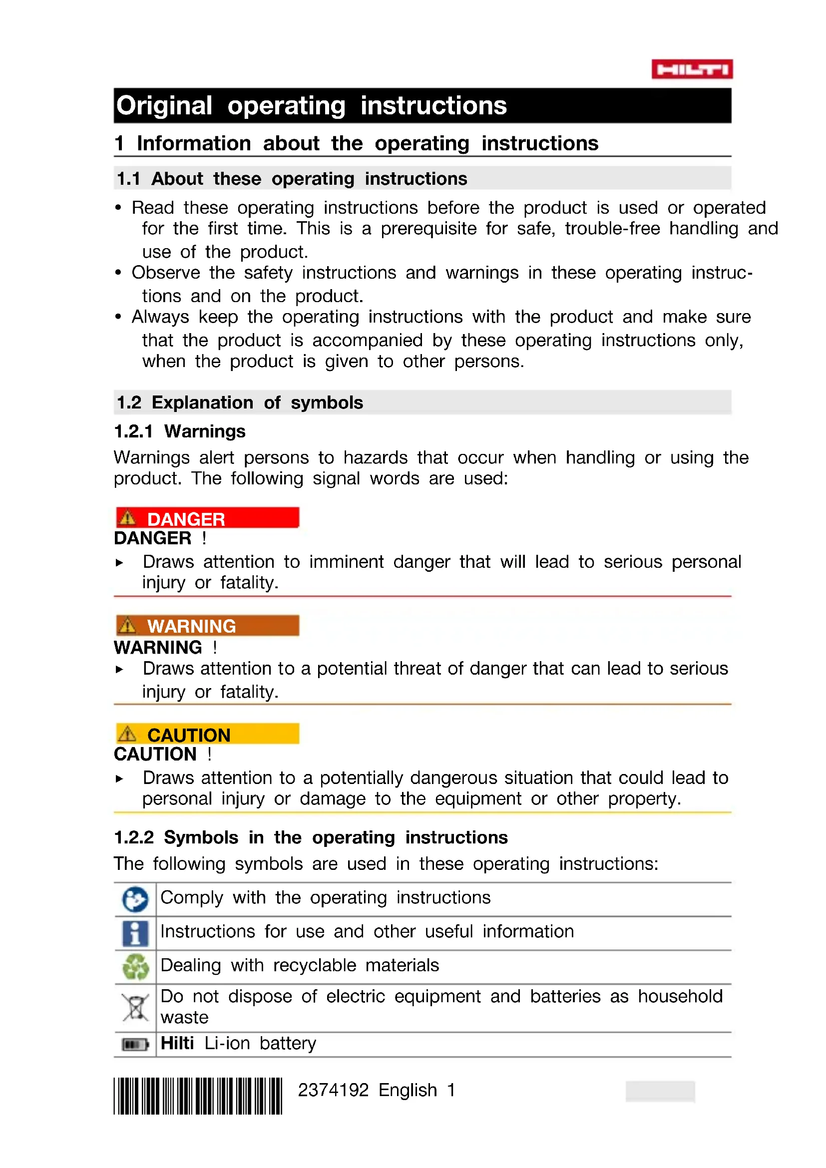 The following symbols are used in these operating instructions: Comply with the operating instructions Instructions for use and other useful information Dealing with recyclable materials Do not dispose of electric equipment and batteries as household waste Hilti Liion battery2 English 2374192 *2374192* Hilti charger