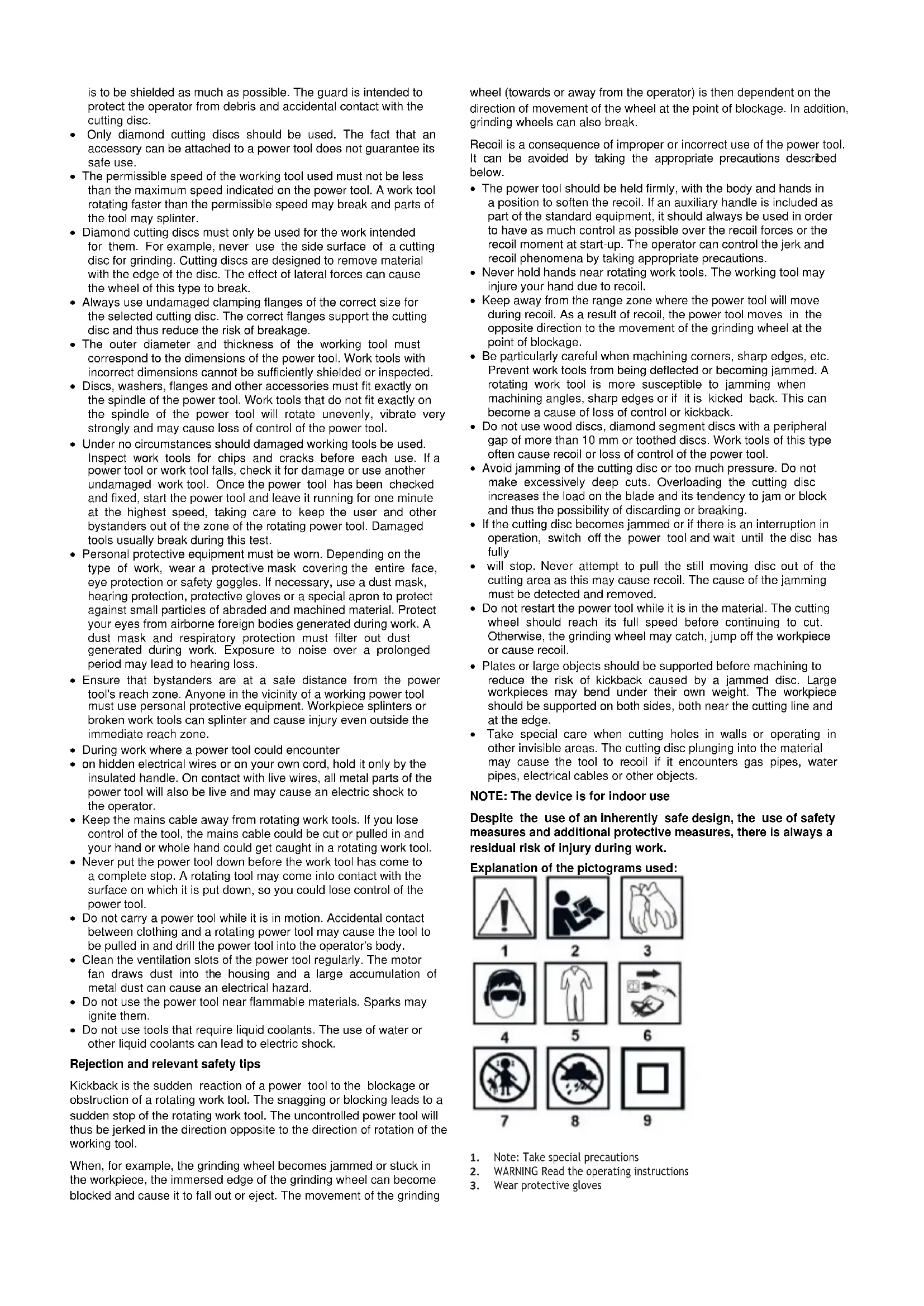 - Take special care when cutting holes in walls or operating in other invisible areas. The cutting disc plunging into the material may cause the tool to recoil if it encounters gas pipes, water pipes, electrical cables or other objects. NOTE: The device is for indoor use Despite the use of an inherently safe design, the use of safety measures and additional protective measures, there is always a residual risk of injury during work. Explanation of the pictograms used: