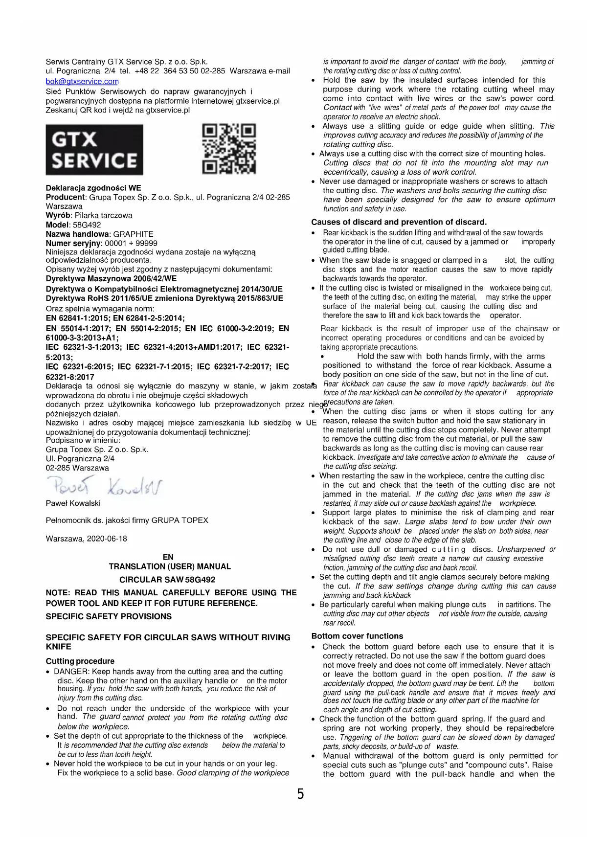 Electrically-powered products should not be disposed of with household waste, but should be taken to appropriate facilities for disposal. Contact your product dealer or local authority for information on disposal. Waste electrical and electronic equipment contains substances that are not environmentally friendly. Equipment that is not recycled poses a potential risk to the environment and human health. "Grupa Topex Spółka z ograniczoną odpowiedzialnością" Spółka komandytowa with its registered office in Warsaw, ul. Pograniczna 2/4 (hereinafter: "Grupa Topex") informs that all copyrights to the content of this manual (hereinafter: "Manual"), including, among others. Its text, photographs, diagrams, drawings, as well as its composition, belong exclusively to Grupa Topex and are subject to legal protection under the Act of 4 February 1994 on Copyright and Related Rights (ie Journal of Laws 2006 No. 90 Poz. 631, as amended). Copying, processing, publishing, modifying for commercial purposes the entire Manual and its individual elements, without the consent of Grupa Topex expressed in writing, is strictly prohibited and may result in civil and criminal liability. EC declaration of conformity Manufacturer: Grupa Topex Sp. Z o.o. Sp.k., Pograniczna 2/4 02-285 Warsaw9 Product: Circular saw Product No.: 58G492 Trade name: GRAPHITE Serial number: 00001 ÷ 99999 This declaration of conformity is issued under the sole responsibility of the manufacturer. The product described above complies with the following documents: Machinery Directive 2006/42/EC Electromagnetic Compatibility Directive 2014/30/EU RoHS Directive 2011/65/EU as amended by Directive 2015/863/EU And meets the requirements of the following standards: EN 62841-1:2015; EN 62841-2-5:2014; EN 55014-1:2017; EN 55014-2:2015; EN IEC 61000-3-2:2019; EN 61000-3-3:2013+A1; IEC 62321-3-1:2013; IEC 62321-4:2013+AMD1:2017; IEC 62321- 5:2013; IEC 62321-6:2015; IEC 62321-7-1:2015; IEC 62321-7-2:2017; IEC 62321-8:2017 This declaration refers only to the machinery in the state in which it was placed on the market and does not cover components added by the end-user or subsequent actions carried out by the end user. Name and address of the person resident or established in the EU authorised to prepare the technical documentation: Signed on behalf of: Grupa Topex Sp. Z o.o. Sp.k. Hive. Borderland 2/4 02-285 Warsaw Pawel Kowalski Quality Representative of GRUPA TOPEX Warsaw, 2020-0 6-18
