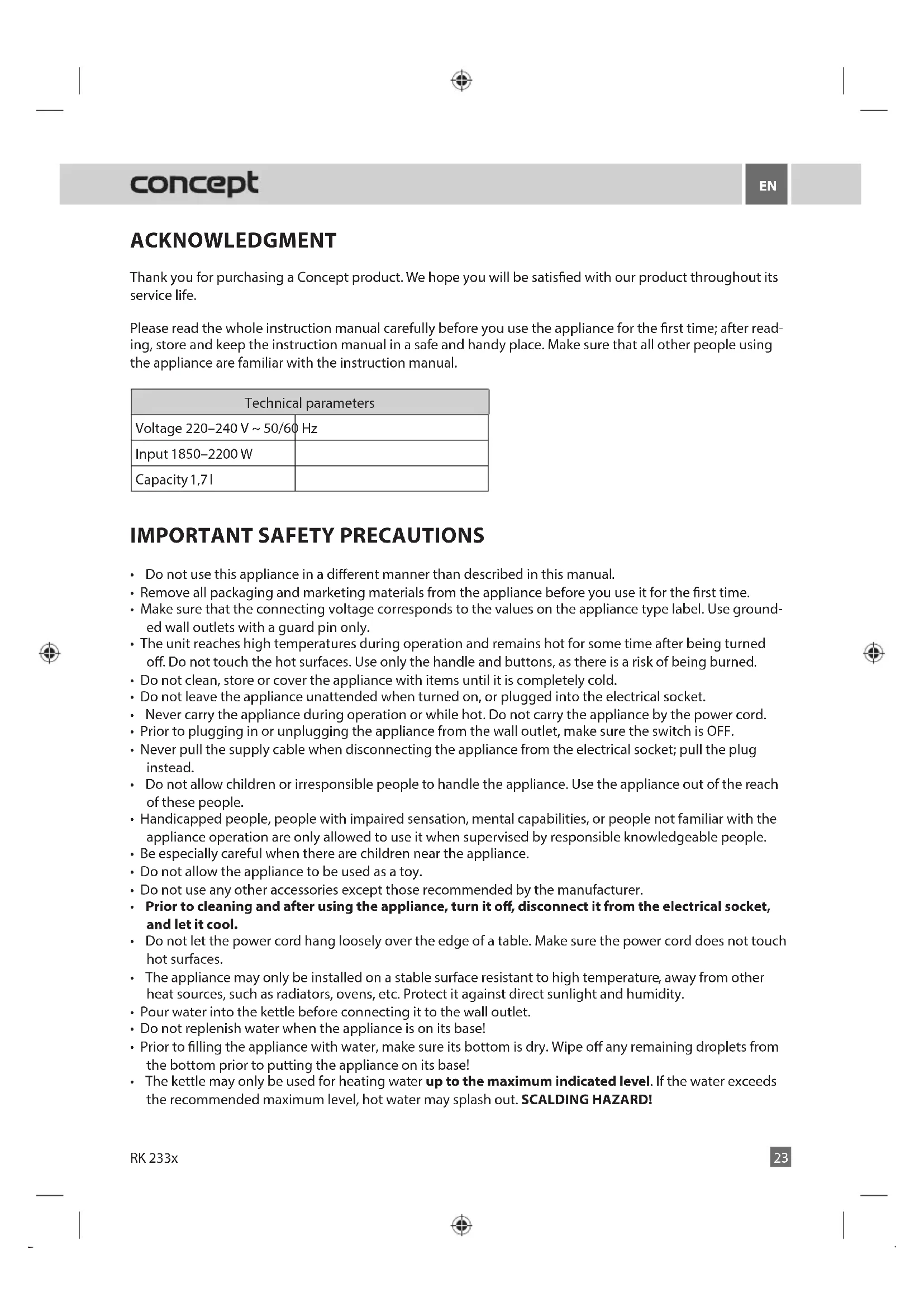 ACKNOWLEDGMENT Thank you for purchasing a Concept product. We hope you will be satised with our product throughout its service life. Please read the whole instruction manual carefully before you use the appliance for the rst time; after read- ing, store and keep the instruction manual in a safe and handy place. Make sure that all other people using the appliance are familiar with the instruction manual. Technical parameters Voltage 220–240 V ~ 50/60 Hz Input 1850–2200 W Capacity 1,7 l