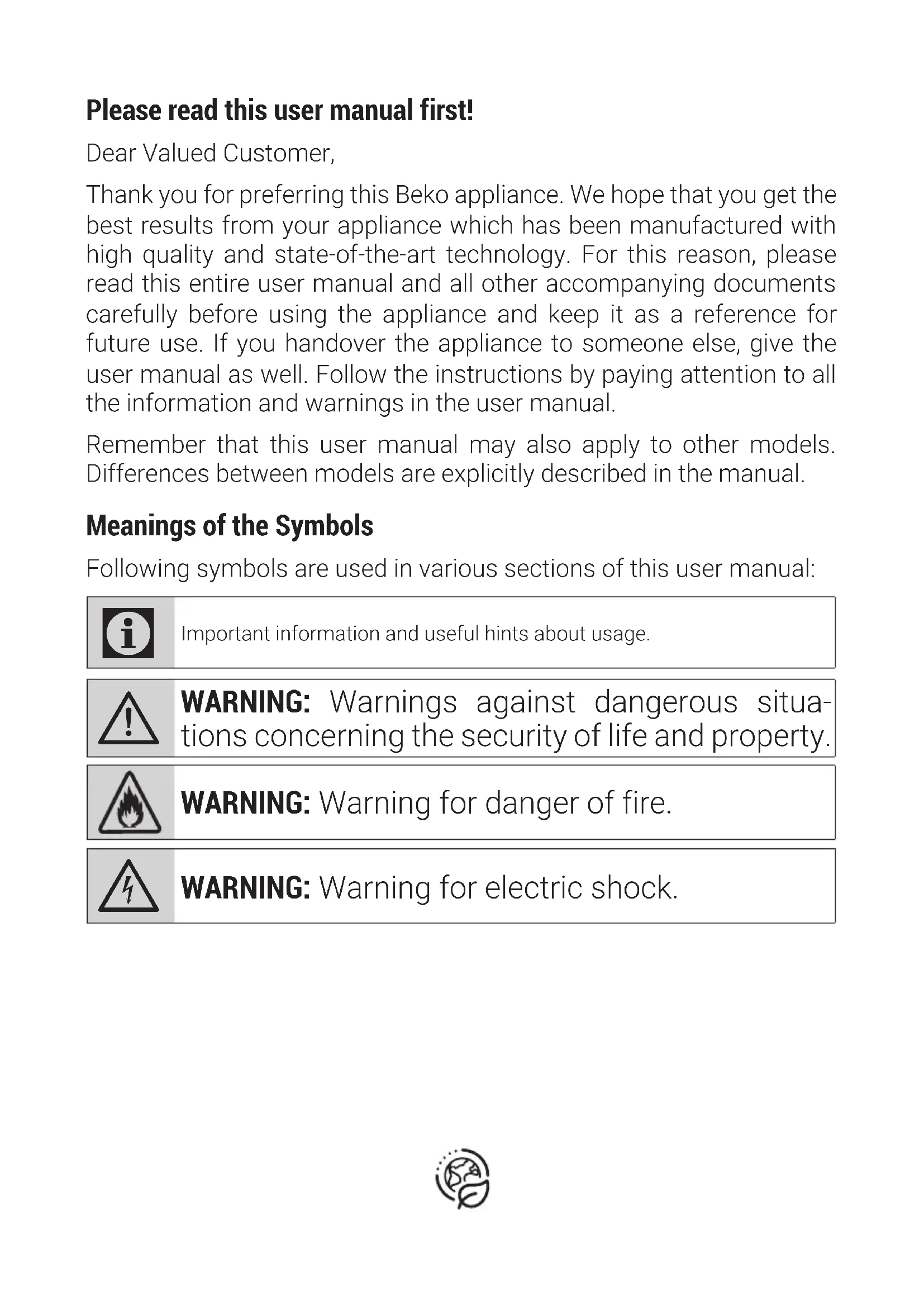 NEDERLANDS 88-102 DEUTSCH 103-118Please read this user manual first! Dear Valued Customer, Thank you for preferring this Beko appliance. We hope that you get the best results from your appliance which has been manufactured with high quality and state-of-the-art technology. For this reason, please read this entire user manual and all other accompanying documents carefully before using the appliance and keep it as a reference for future use. If you handover the appliance to someone else, give the user manual as well. Follow the instructions by paying attention to all the information and warnings in the user manual. Remember that this user manual may also apply to other models. Differences between models are explicitly described in the manual. Meanings of the Symbols Following symbols are used in various sections of this user manual: