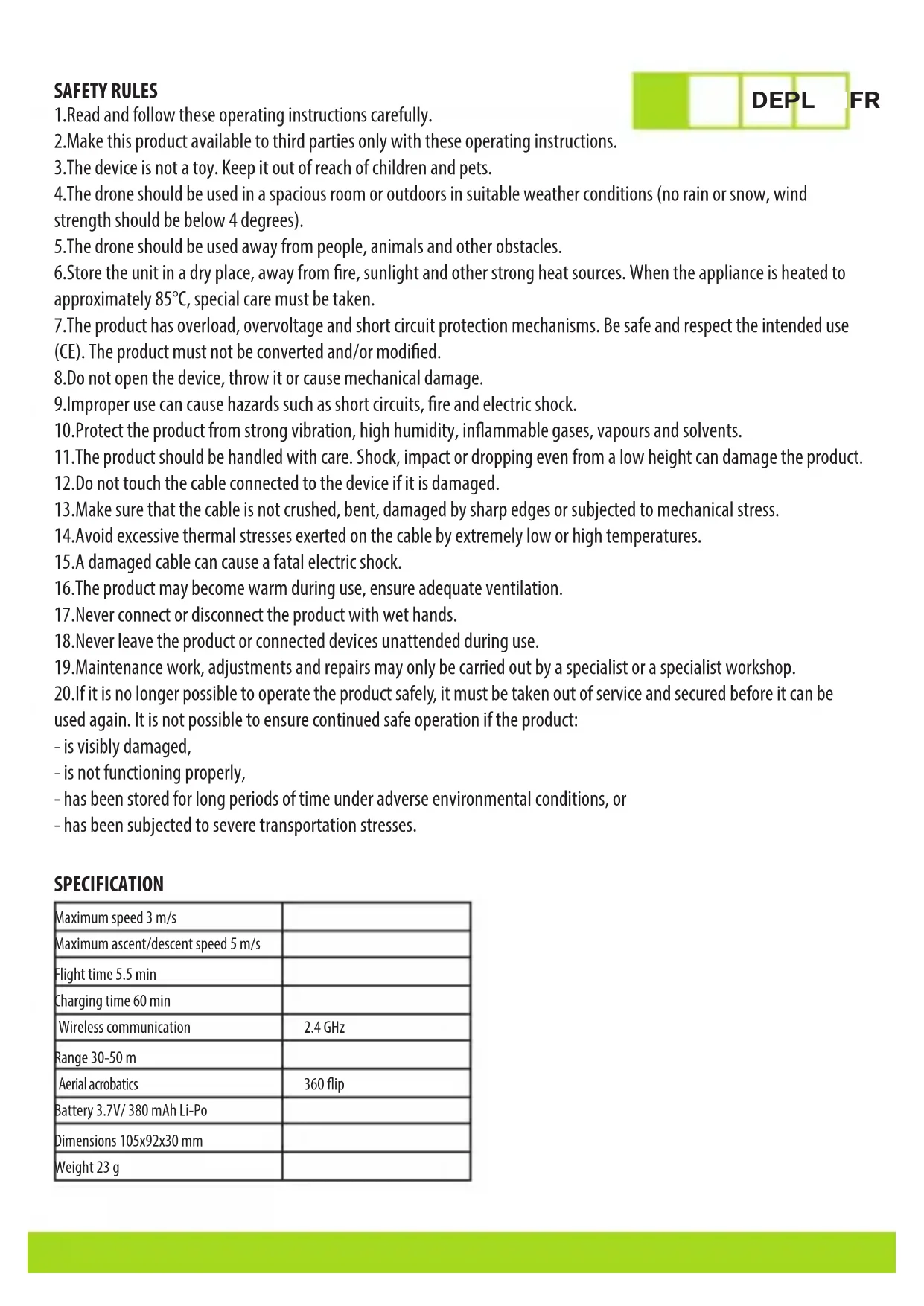 UDR-1808SPECIFICATION SAFETY RULES 1.Read and follow these operating instructions carefully. 2.Make this product available to third parties only with these operating instructions. 3.The device is not a toy. Keep it out of reach of children and pets. 4.The drone should be used in a spacious room or outdoors in suitable weather conditions (no rain or snow, wind strength should be below 4 degrees). 5.The drone should be used away from people, animals and other obstacles. 6.Store the unit in a dry place, away from re, sunlight and other strong heat sources. When the appliance is heated to approximately 85°C, special care must be taken. 7.The product has overload, overvoltage and short circuit protection mechanisms. Be safe and respect the intended use (CE). The product must not be converted and/or modied. 8.Do not open the device, throw it or cause mechanical damage. 9.Improper use can cause hazards such as short circuits, re and electric shock. 10.Protect the product from strong vibration, high humidity, inammable gases, vapours and solvents. 11.The product should be handled with care. Shock, impact or dropping even from a low height can damage the product. 12.Do not touch the cable connected to the device if it is damaged. 13.Make sure that the cable is not crushed, bent, damaged by sharp edges or subjected to mechanical stress. 14.Avoid excessive thermal stresses exerted on the cable by extremely low or high temperatures. 15.A damaged cable can cause a fatal electric shock. 16.The product may become warm during use, ensure adequate ventilation. 17.Never connect or disconnect the product with wet hands. 18.Never leave the product or connected devices unattended during use. 19.Maintenance work, adjustments and repairs may only be carried out by a specialist or a specialist workshop. 20.If it is no longer possible to operate the product safely, it must be taken out of service and secured before it can be used again. It is not possible to ensure continued safe operation if the product: - is visibly damaged, - is not functioning properly, - has been stored for long periods of time under adverse environmental conditions, or - has been subjected to severe transportation stresses. Maximum speed 3 m/s Battery 3.7V/ 380 mAh Li-Po Dimensions 105x92x30 mm Flight time 5.5 min Charging time 60 min Aerial acrobatics 360 ip Weight 23 g Maximum ascent/descent speed 5 m/s Range 30-50 m