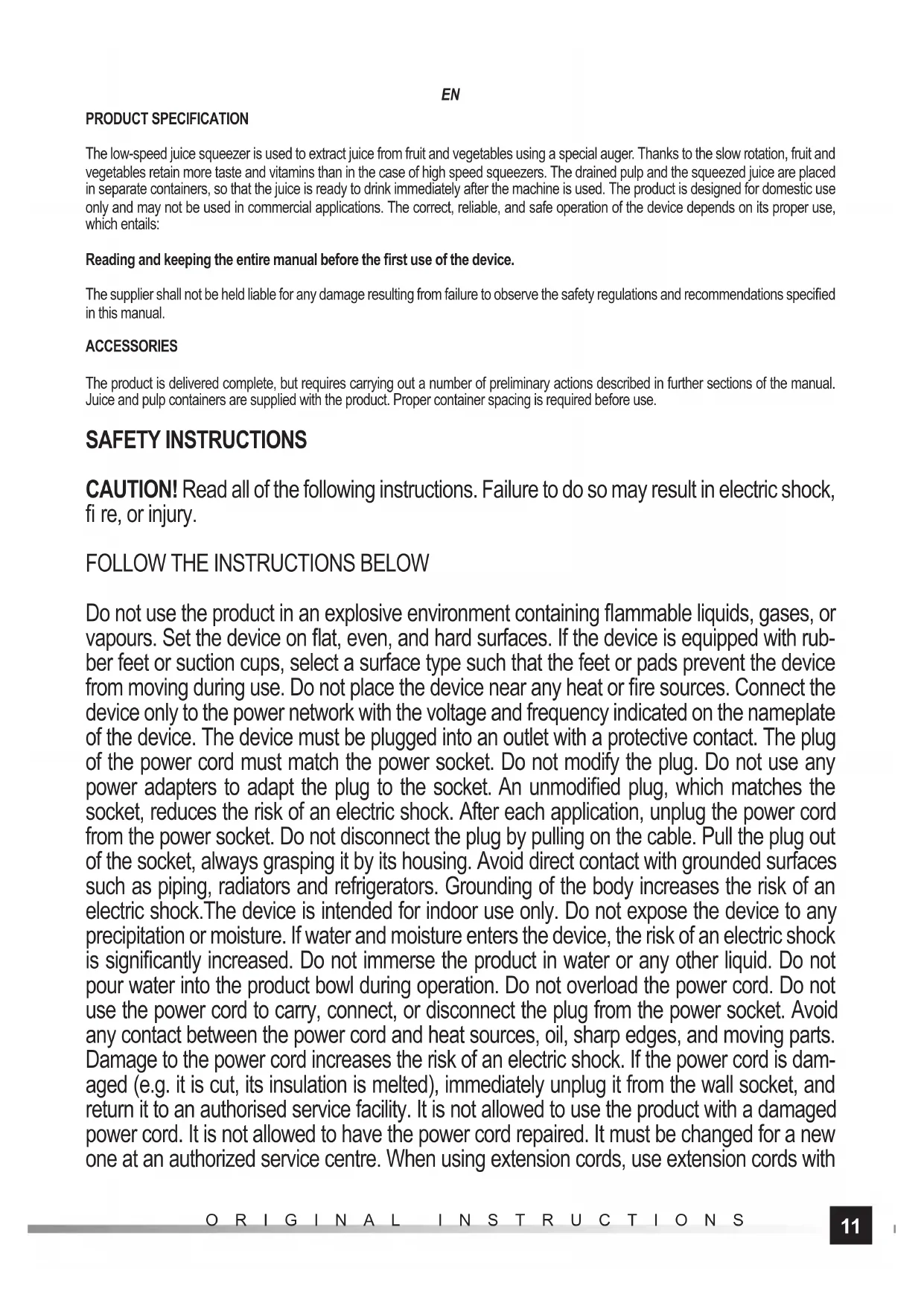 ORIGINAL INSTRUCTIONS PRODUCT SPECIFICATION The low-speed juice squeezer is used to extract juice from fruit and vegetables using a special auger. Thanks to the slow rotation, fruit and vegetables retain more taste and vitamins than in the case of high speed squeezers. The drained pulp and the squeezed juice are placed in separate containers, so that the juice is ready to drink immediately after the machine is used. The product is designed for domestic use only and may not be used in commercial applications. The correct, reliable, and safe operation of the device depends on its proper use, which entails: Reading and keeping the entire manual before the fi rst use of the device. The supplier shall not be held liable for any damage resulting from failure to observe the safety regulations and recommendations specifi ed in this manual. ACCESSORIES The product is delivered complete, but requires carrying out a number of preliminary actions described in further sections of the manual. Juice and pulp containers are supplied with the product. Proper container spacing is required before use. SAFETY INSTRUCTIONS CAUTION! Read all of the following instructions. Failure to do so may result in electric shock, fi re, or injury.