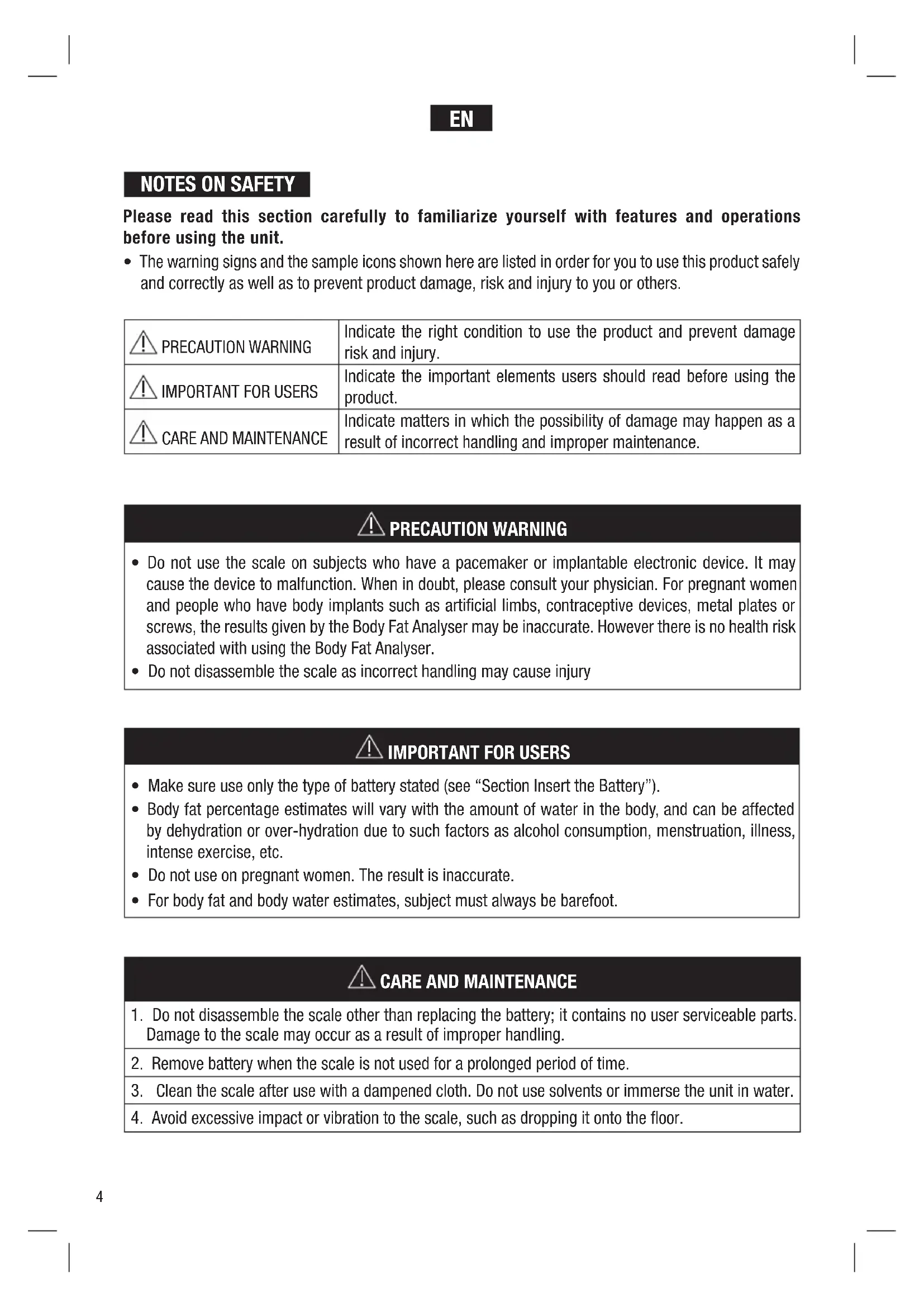 - Do not use the scale on subjects who have a pacemaker or implantable electronic device. It may cause the device to malfunction. When in doubt, please consult your physician. For pregnant women and people who have body implants such as artificial limbs, contraceptive devices, metal plates or screws, the results given by the Body Fat Analyser may be inaccurate. However there is no health risk associated with using the Body Fat Analyser.