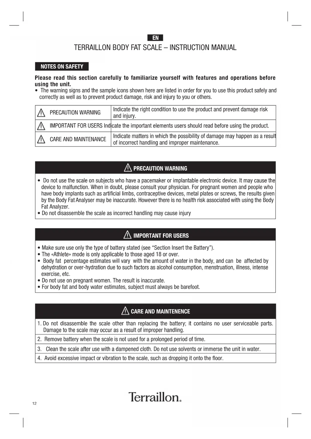 Download the instructions for your Scale in PDF format for free! Find your manual Control Fit - TERRAILLON and take your electronic device back in hand. On this page are published all the documents necessary for the use of your device. Control Fit by TERRAILLON.