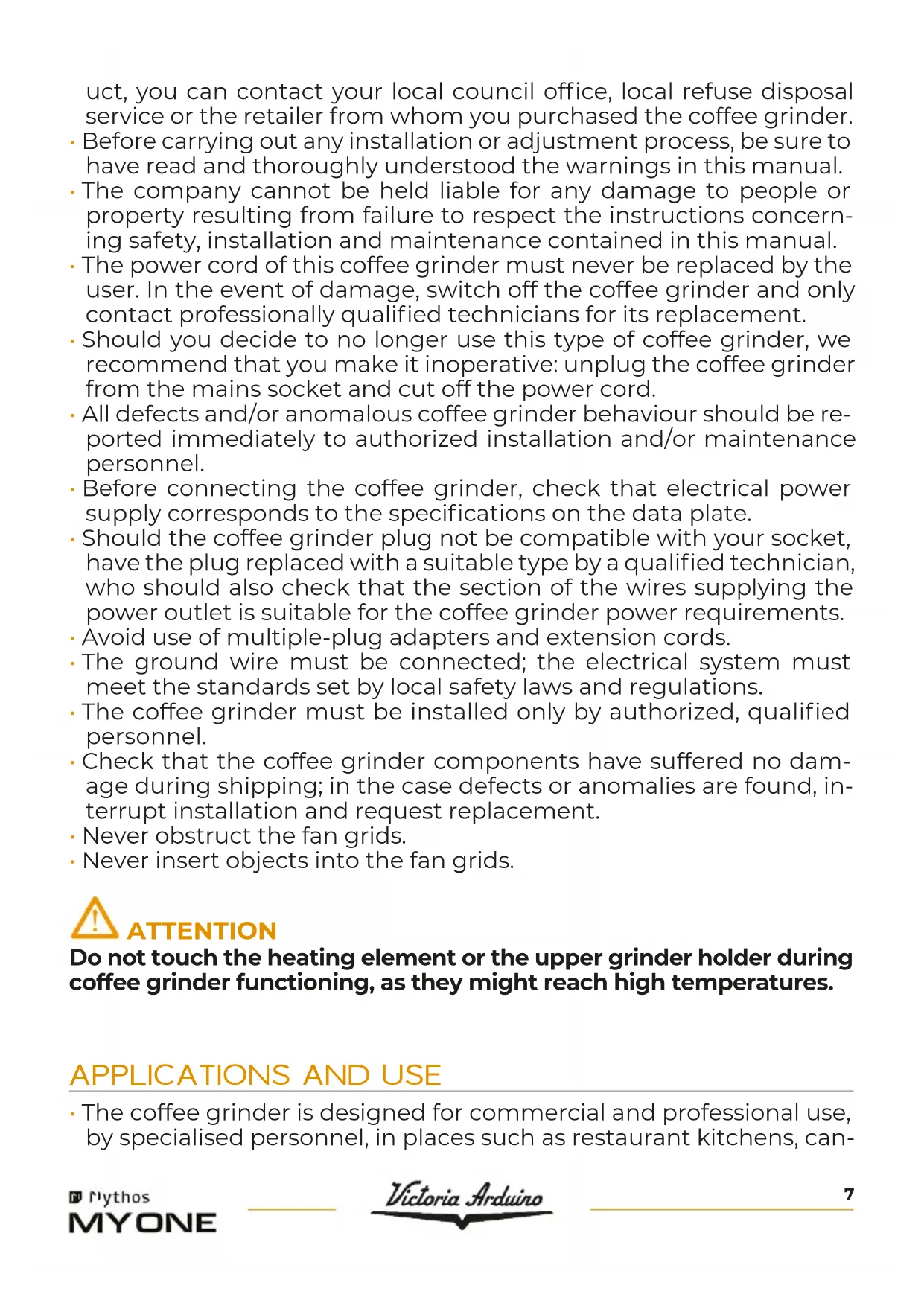 Coffee grinder design has taken into account all reasonable user safe- ty precautions; nevertheless, particular conditions of installation and/ or handling may create unforeseen situations beyond the installer’s control which will require case-by-case evaluation of residual risks. We recommend keeping the following in mind. If the manufacturer re- stricts the use of the coffee grinder, except as described, this will be clearly indicated in this instruction manual.
