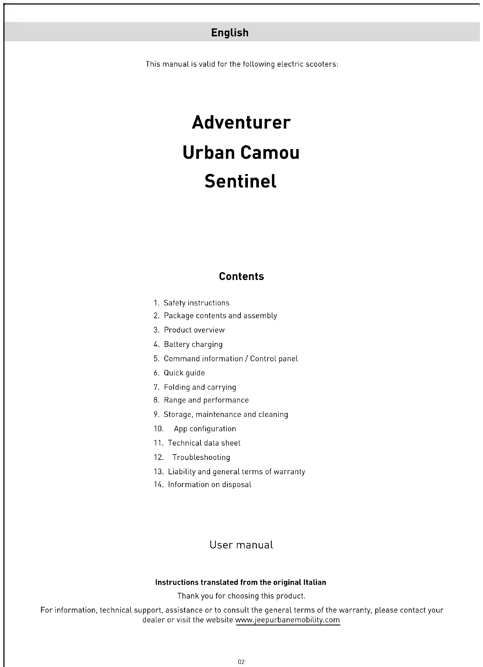 - By taking it to shops selling new electrical and electronic equipment. Very small WEEE items (with the longest side less than 25 cm) my be deposited here free of charge, while larger WEEE items may be deposited on a 1-for-1 basis, i.e. by depositing an old product when purchasing a new one with the same functions. Moreover, the 1-on-1 mode is always guaranteed when the consumer purchases a new EEE, regardless of the size of the WEEE. Intheeventofunlawfuldisposalofelectricalandelectronicequipment,specicsanctionsmaybeappliedbythelaws governing the protection of the environment. IftheWEEEcontainsbatteriesoraccumulators,theymustberemovedandsubjectedtospecicseparatecollection. CAUTION Handling of spent batteries (applicable in all European Union countries and in other European systems with separate collection systems) This symbol on the product or packaging indicates that the battery pack should not be treated as normal household waste. On some types of batteries, this symbol may be used in combination with a chemical symbol. The chemical symbols for mercury (Hg) or lead (Pb) are added if the battery contains morethan0.0005%mercuryor0.004%lead. By ensuring that the batteries are disposed of correctly, you will help prevent potential negative consequences for the environment and human health, which may otherwise be caused by inappropriate disposal. Recycling materials will help to conserve natural resources. In the case of products which, for safety, performance or dataprotectionpurposesrequireaxedconnectiontoaninternalbattery,thisshould onlybereplacedbyqualiedservicepersonnel. Deliver the product at the end of its service life to collection centres suitable for the disposal of electrical and electronic equipment: this ensures that the battery inside it is also treated correctly. For more detailed information about disposal of the dead battery, contact the local waste disposal service or the shop where it was purchased. In any case, disposal must be carried out in accordance with the legislation in force in the country of purchase.24 Manuale d’uso Indice Istruzioni originali Grazie per aver scelto questo prodotto. Per informazioni, supporto tecnico, assistenza e per consultare i termini generali di garanzia rivolgersi al proprio rivenditore o visita il sito www.jeepurbanemobility.com Per i ricambi vai sul sito www.urbanemobility.com Questo manuale è valido per i seguenti monopattini elettrici: Adventurer Urban Camou Sentinel Italiano