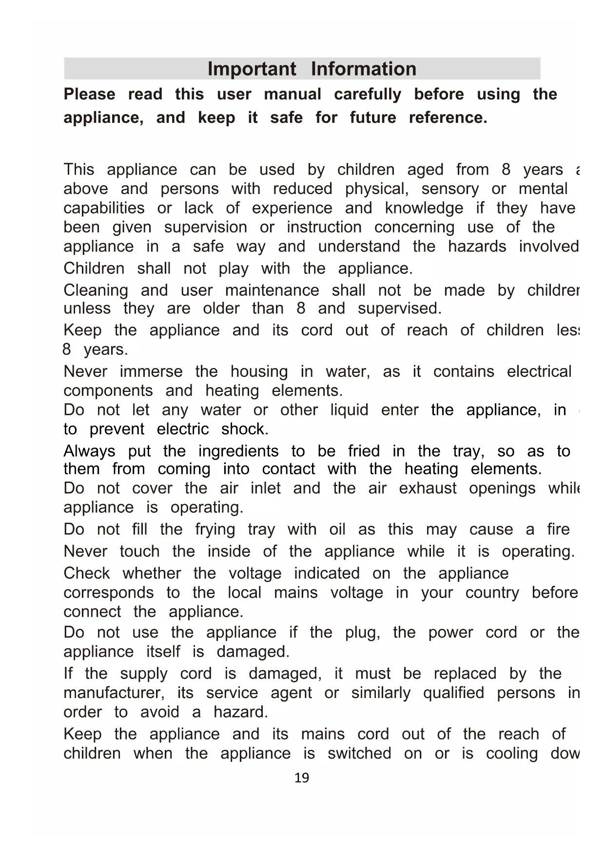 France19 Important Information Please read this user manual carefully before using the appliance, and keep it safe for future reference. This appliance can be used by children aged from 8 years and above and persons with reduced physical, sensory or mental capabilities or lack of experience and knowledge if they have been given supervision or instruction concerning use of the appliance in a safe way and understand the hazards involved. Children shall not play with the appliance. Cleaning and user maintenance shall not be made by children unless they are older than 8 and supervised. Keep the appliance and its cord out of reach of children less than 8 years. Never immerse the housing in water, as it contains electrical components and heating elements. Do not let any water or other liquid enter the appliance, in order to prevent electric shock. Always put the ingredients to be fried in the tray, so as to prevent them from coming into contact with the heating elements. Do not cover the air inlet and the air exhaust openings while the appliance is operating. Do not fill the frying tray with oil as this may cause a fire hazard. Never touch the inside of the appliance while it is operating. Check whether the voltage indicated on the appliance corresponds to the local mains voltage in your country before you connect the appliance. Do not use the appliance if the plug, the power cord or the appliance itself is damaged. If the supply cord is damaged, it must be replaced by the manufacturer, its service agent or similarly qualified persons in order to avoid a hazard. Keep the appliance and its mains cord out of the reach of children when the appliance is switched on or is cooling down.20 Keep the main cord away from hot surfaces. Do not plug in the appliance or operate the control panel with wet hands. Only connect the appliance to an earthed wall socket, and always make sure that the plug is inserted into the wall socket properly. The appliance is not intended to be operated by means of an external timer or separate remote-control system. Do not place the appliance on or near combustible materials such as a tablecloth or curtains. Do not place the appliance against a wall or against other appliances. Leave at least 10 cm of free space at the back side and 10 cm of free space above the appliance. Do not place anything on top of the appliance. Do not use the appliance for any purpose other than what is described in this manual. Do not leave the appliance unattended while in operation. During hot air frying, hot steam is released through the air exhaust openings. Therefore, keep your hands and face at a safe distance from the steam and the air exhaust openings. Be careful of hot steam and hot air when you remove the frying tray from the appliance. The surface below the appliance may become hot during use. Unplug the appliance immediately if you see dark smoke coming out of the appliance. Wait for the smoke emission to stop before you remove the frying tray from the appliance. This appliance is intended to be used in households only. For details on how to clean surfaces in contact with food, please refer to the “Cleaning” section of this manual. Caution - Place the appliance on a horizontal and stable surface. - Always unplug the appliance after use. - Let the appliance cool down for about 30 minutes before21 handling or cleaning it. - Remove any burnt remains of food. - If the appliance is used improperly or if it is not used according to the instructions in the user manual, the warranty will become invalid, and the seller will not be held liable for any damage that may be caused. Before using your air fryer for the first time