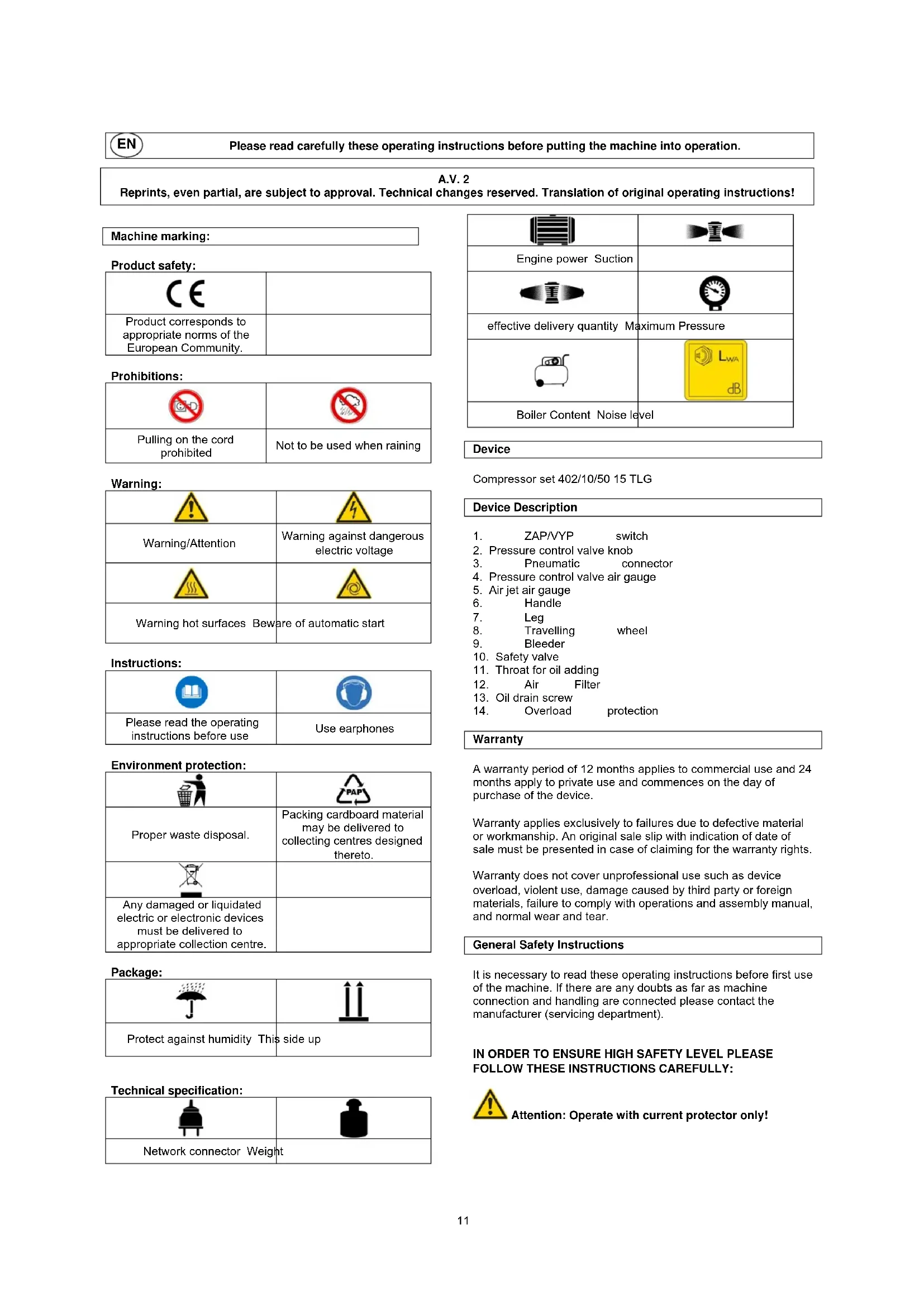10EN Please read carefully these operating instructions before putting the machine into operation. A.V. 2 Reprints, even partial, are subject to approval. Technical changes reserved. Translation of original operating instructions!