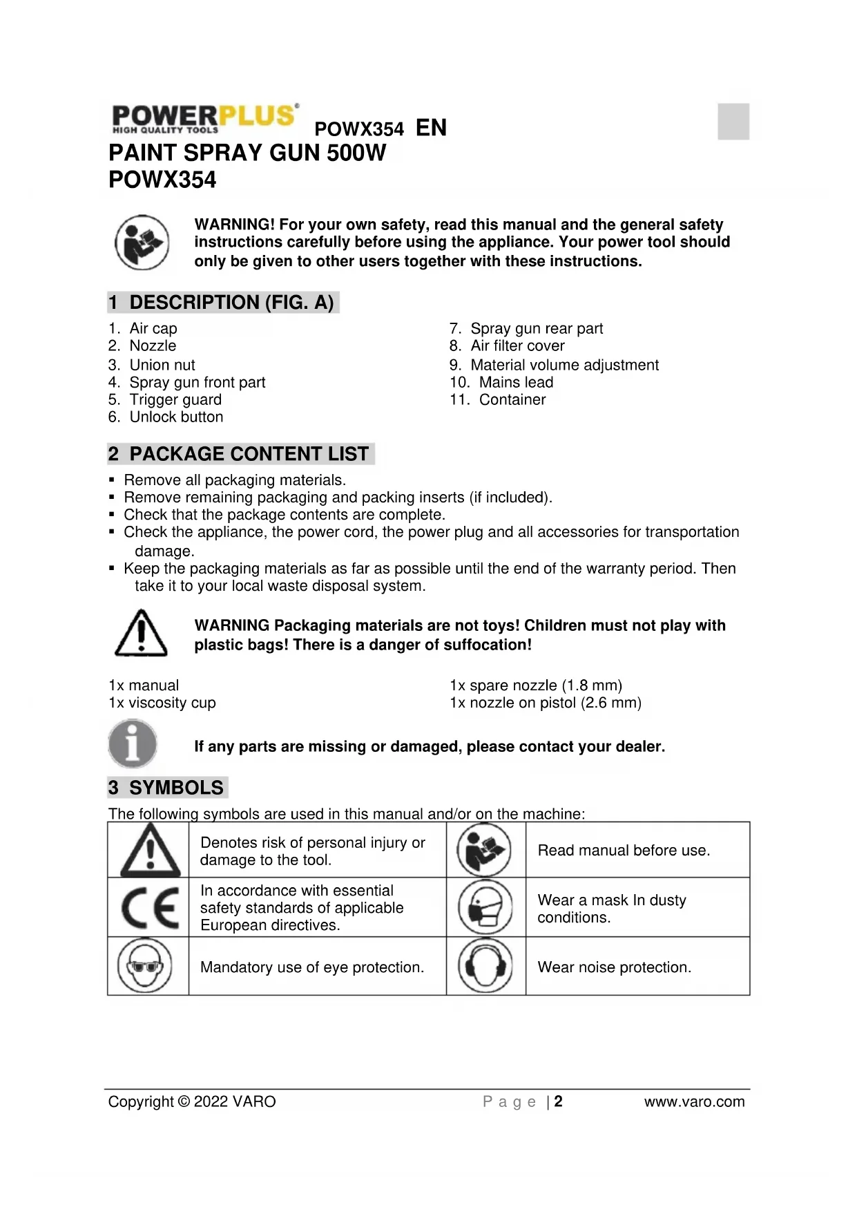 - Keep the packaging materials as far as possible until the end of the warranty period. Then take it to your local waste disposal system. WARNING Packaging materials are not toys! Children must not play with plastic bags! There is a danger of suffocation! 1x manual 1x viscosity cup 1x spare nozzle (1.8 mm) 1x nozzle on pistol (2.6 mm) If any parts are missing or damaged, please contact your dealer. 3 SYMBOLS The following symbols are used in this manual and/or on the machine: