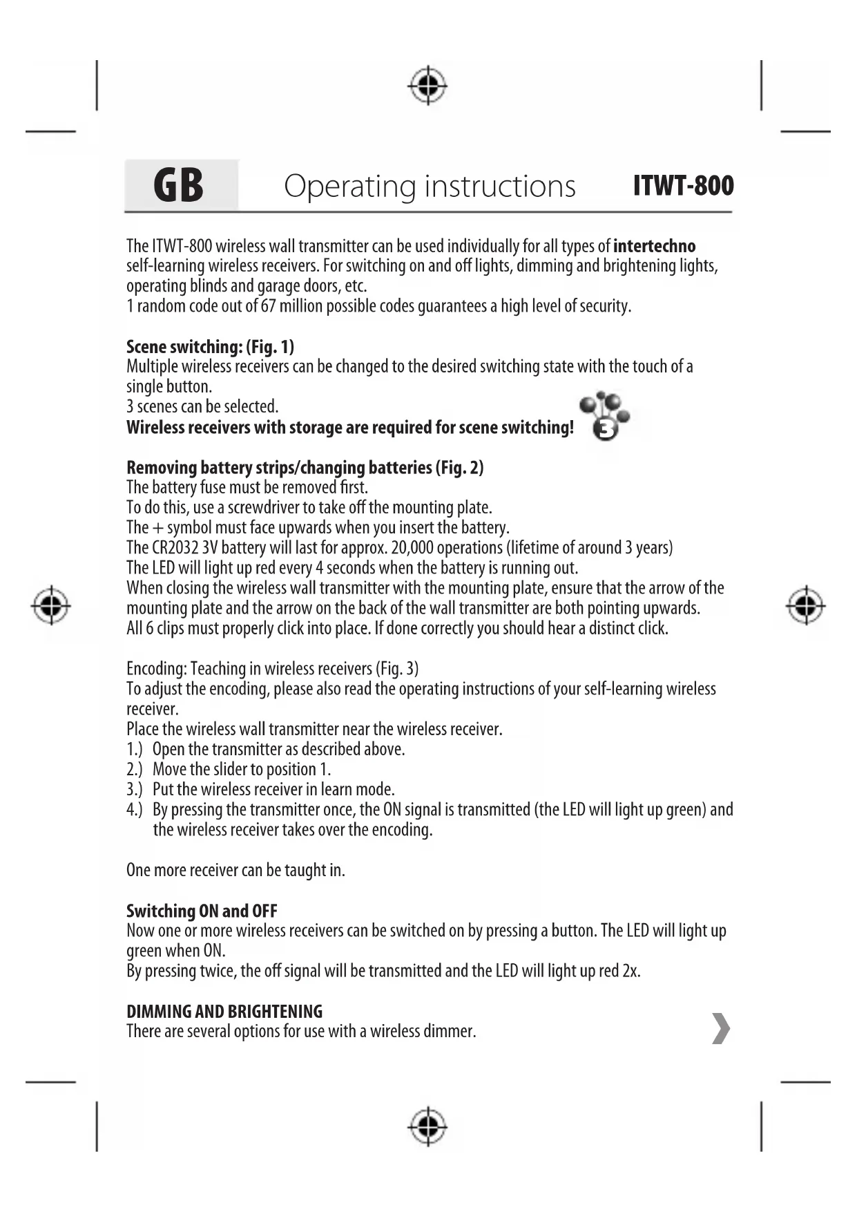 ITWT-800 31.) Start the dimming cycle by pressing the on signal again and stop the dimming or brightening at the desired brightness with the on signal (press once). Or2.) Keep the button pressed to dim or brighten the device until the desired brightness is reached then release it to stop. If the last operation was brightening, pressing again dims the device and vice versa.The last used brightness remains saved until the device is switched on again.Please note that older and newer wireless dimmer receiver models may differ slightly.The dimming cycle is continuous on older dimmer models when brightening and dimming.On newer models the brightness is stopped at the brightest and dimmest points respectively.A synchronous dimming cycle with multiple dimmer receivers is not guaranteed.Erasing encoding To erase the encoding, proceed as described above in 2.) to 4.), but now the off signal is transmit-ted by pressing 2x.The LED will light up red 2x.If no scene switching is required, the settings are now complete and you can proceed to mount the switch.Saving for scene switching (Fig. 4)Only for wireless receivers which are suitable for scene switching.3 different scenes can be saved.To set a scene with several wireless receivers, it is recommended you use a handheld transmitter such as the ITLS-16, ITT-1500, etc. Use it to set your wireless receivers to the desired state, for example, dimmer setting (setting the desired brightness) or to switch them on or off.If no other handheld transmitter is available, the wireless wall transmitter in slider position 1 can be used to program the settings of one wireless receiver after another. The last selected brightness setting remains the same for dimmers when they are switched off.Scene 1: Move the slider to position 3 and press once for scene 1. The LED will light up green 3x as confirmation and orange once for scene 1. Scene 1 is saved.Scene 2: Again select the settings and move the slider to position 3 and finally press 2x.The LED will light up green 3x and orange 2x.