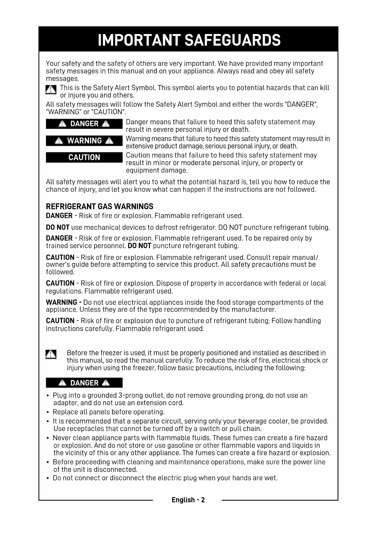 DANGER - Risk of fire or explosion. Flammable refrigerant used. DO NOT use mechanical devices to defrost refrigerator. DO NOT puncture refrigerant tubing. DANGER - Risk of fire or explosion. Flammable refrigerant used. To be repaired only by trained service personnel. DO NOT puncture refrigerant tubing. CAUTION - Risk of fire or explosion. Flammable refrigerant used. Consult repair manual/ owner’s guide before attempting to service this product. All safety precautions must be followed. CAUTION - Risk of fire or explosion. Dispose of property in accordance with federal or local regulations. Flammable refrigerant used. WARNING - Do not use electrical appliances inside the food storage compartments of the appliance. Unless they are of the type recommended by the manufacturer. CAUTION - Risk of fire or explosion due to puncture of refrigerant tubing; Follow handling instructions carefully. Flammable refrigerant used. Before the freezer is used, it must be properly positioned and installed as described in this manual, so read the manual carefully. To reduce the risk of fire, electrical shock or injury when using the freezer, follow basic precautions, including the following: