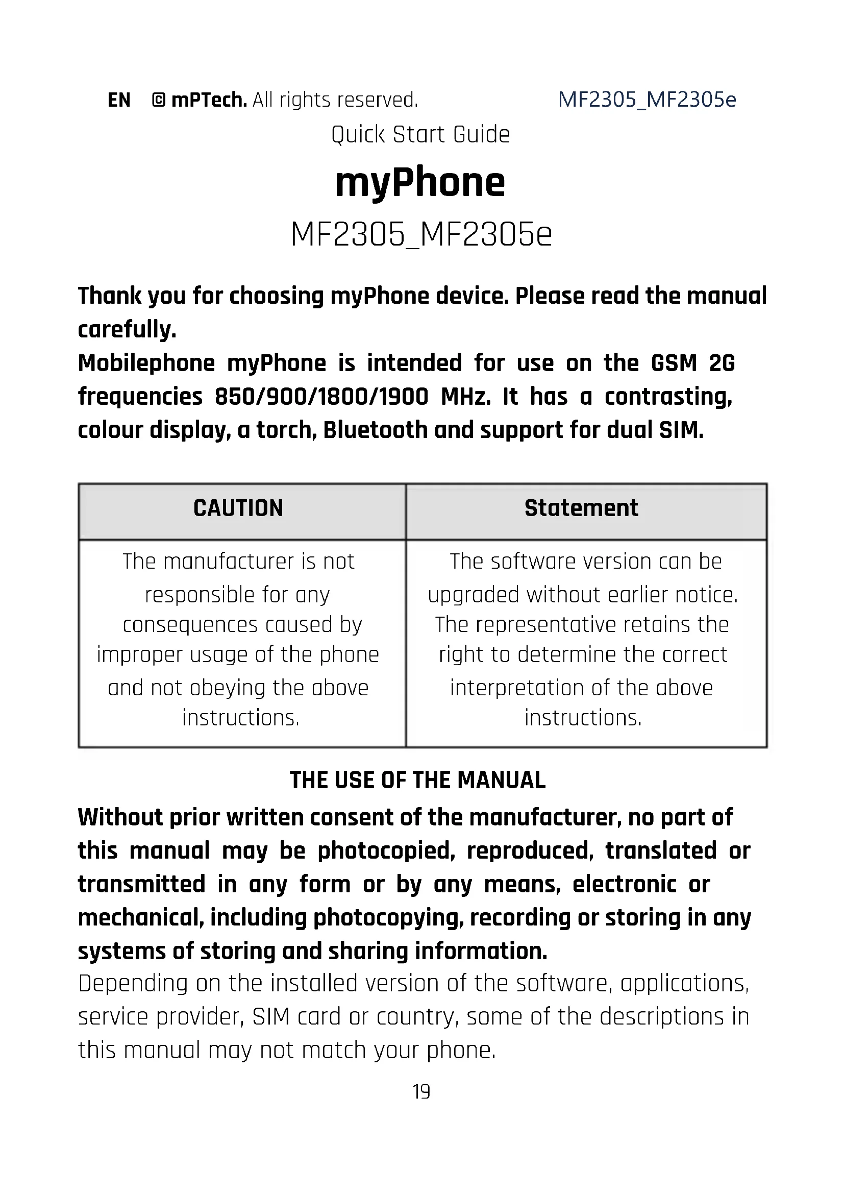 Without prior written consent of the manufacturer, no part of this manual may be photocopied, reproduced, translated or transmitted in any form or by any means, electronic or mechanical, including photocopying, recording or storing in any systems of storing and sharing information. Depending on the installed version of the software, applications, service provider, SIM card or country, some of the descriptions in this manual may not match your phone.EN © mPTech. All rights reserved. MF2305_MF2305e