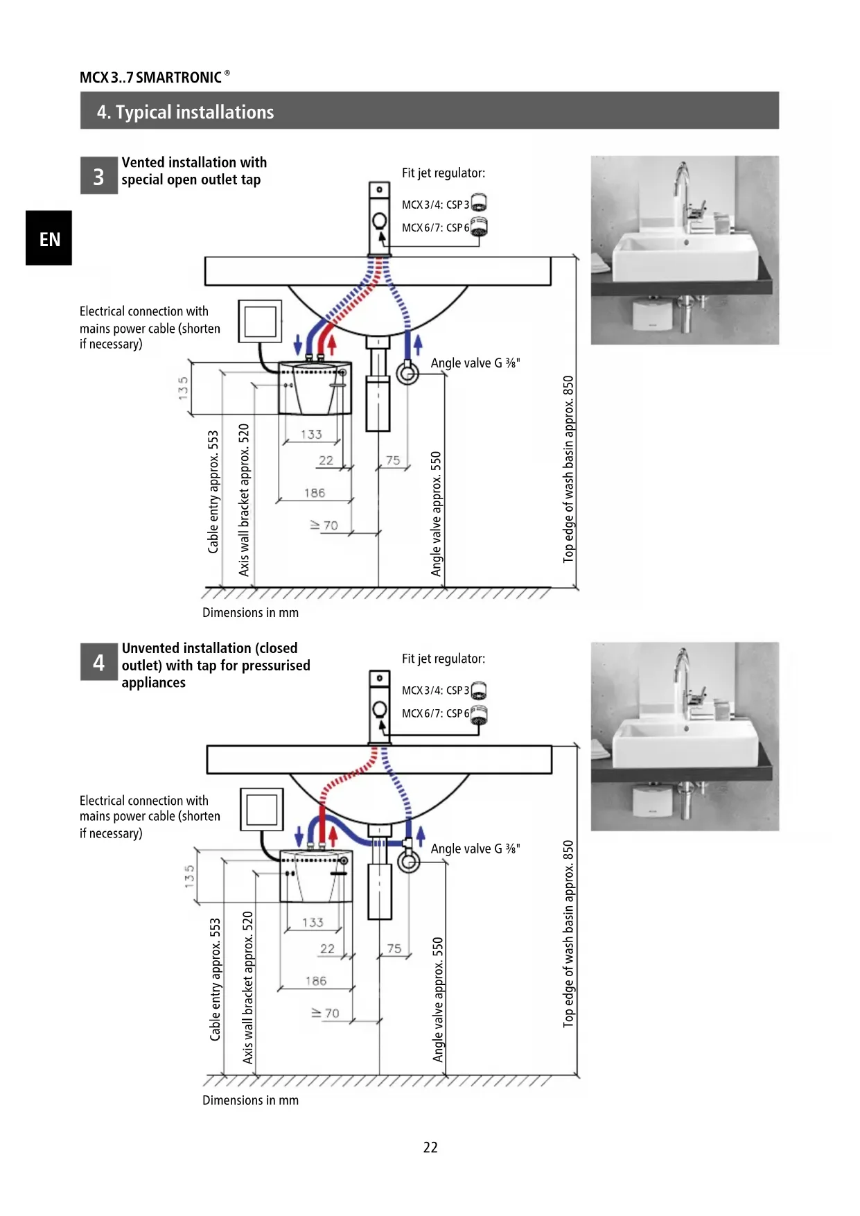 Vented installation with specialopenoutlettap .............................................22 Unvented installation (closed outlet) with tap for pressurised appliances ........................22