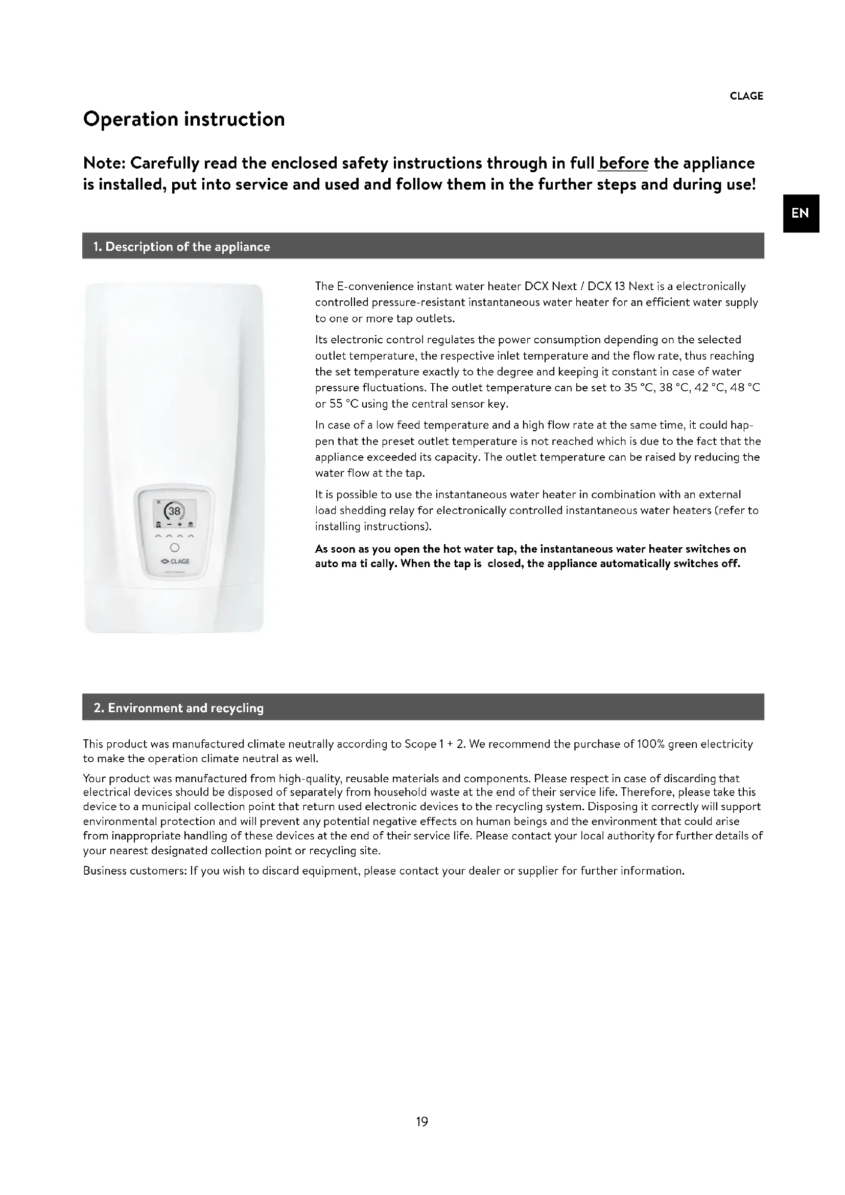As soon as you open the hot water tap, the instantaneous water heater switches on auto ma ti cally. When the tap is closed, the appliance automatically switches off. The E-convenience instant water heater DCX Next / DCX 13 Next is a electronically controlled pressure-resistant instantaneous water heater for an efficient water supply to one or more tap outlets. Its electronic control regulates the power consumption depending on the selected outlet temperature, the respective inlet temperature and the flow rate, thus reaching the set temperature exactly to the degree and keeping it constant in case of water pressure fluctuations. The outlet temperature can be set to 35 °C, 38 °C, 42 °C, 48 °C or 55 °C using the central sensor key. In case of a low feed temperature and a high flow rate at the same time, it could hap- pen that the preset outlet temperature is not reached which is due to the fact that the appliance exceeded its capacity. The outlet temperature can be raised by reducing the water flow at the tap. It is possible to use the instantaneous water heater in combination with an external load shedding relay for electronically controlled instantaneous water heaters (refer to installing instructions). This product was manufactured climate neutrally according to Scope 1 + 2. We recommend the purchase of 100% green electricity to make the operation climate neutral as well. Your product was manufactured from high-quality, reusable materials and components. Please respect in case of discarding that electrical devices should be disposed of separately from household waste at the end of their service life. Therefore, please take this device to a municipal collection point that return used electronic devices to the recycling system. Disposing it correctly will support environmental protection and will prevent any potential negative effects on human beings and the environment that could arise from inappropriate handling of these devices at the end of their service life. Please contact your local authority for further details of your nearest designated collection point or recycling site. Business customers: If you wish to discard equipment, please contact your dealer or supplier for further information.