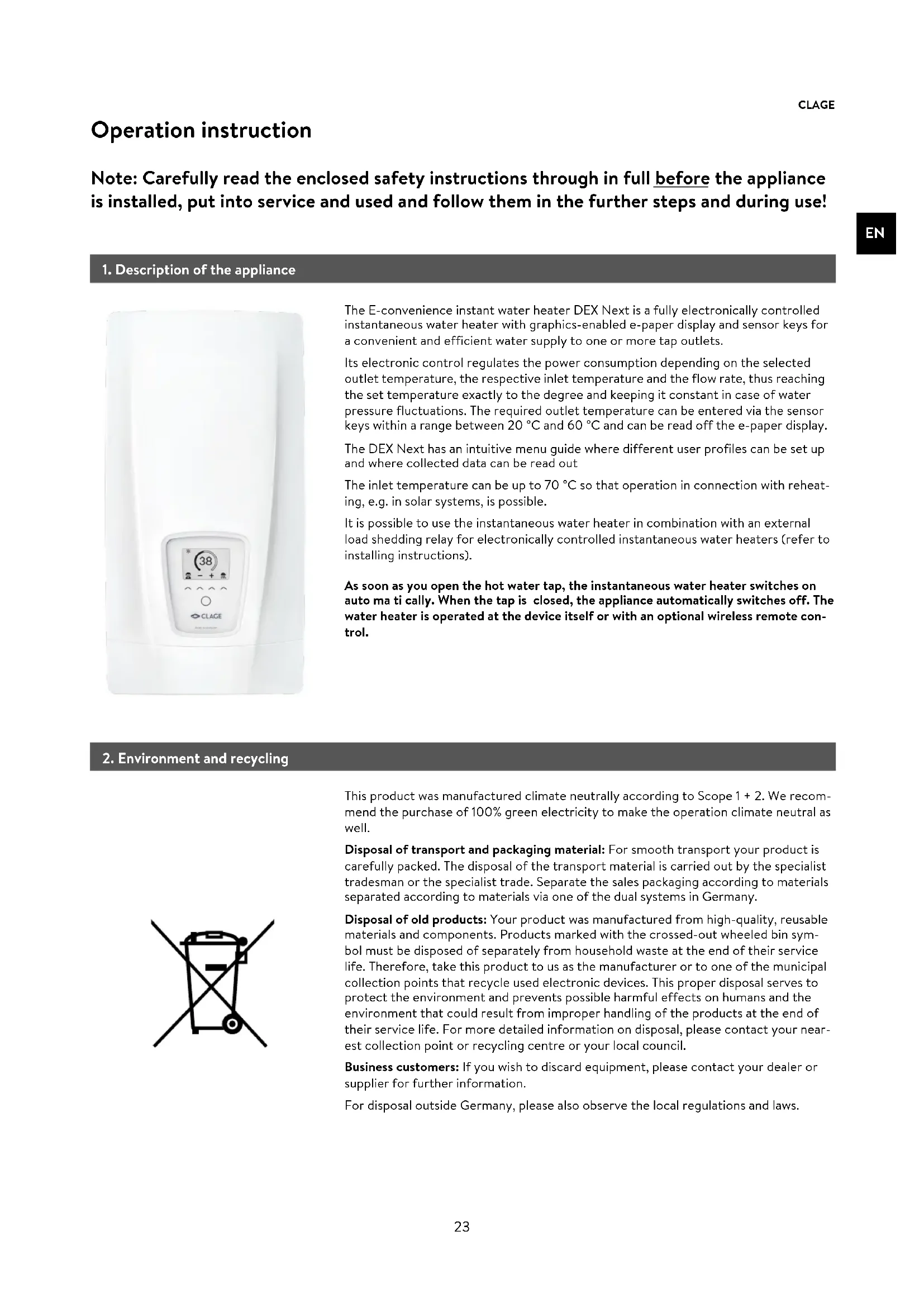 As soon as you open the hot water tap, the instantaneous water heater switches on auto ma ti cally. When the tap is closed, the appliance automatically switches off. The water heater is operated at the device itself or with an optional wireless remote con- trol. The E-convenience instant water heater DEX Next is a fully electronically controlled instantaneous water heater with graphics-enabled e-paper display and sensor keys for a convenient and efficient water supply to one or more tap outlets. Its electronic control regulates the power consumption depending on the selected outlet temperature, the respective inlet temperature and the flow rate, thus reaching the set temperature exactly to the degree and keeping it constant in case of water pressure fluctuations. The required outlet temperature can be entered via the sensor keys within a range between 20 °C and 60 °C and can be read off the e-paper display. The DEX Next has an intuitive menu guide where different user profiles can be set up and where collected data can be read out The inlet temperature can be up to 70 °C so that operation in connection with reheat- ing, e.g. in solar systems, is possible. It is possible to use the instantaneous water heater in combination with an external load shedding relay for electronically controlled instantaneous water heaters (refer to installing instructions). This product was manufactured climate neutrally according to Scope 1 + 2. We recom- mend the purchase of 100% green electricity to make the operation climate neutral as well. Disposal of transport and packaging material: For smooth transport your product is carefully packed. The disposal of the transport material is carried out by the specialist tradesman or the specialist trade. Separate the sales packaging according to materials separated according to materials via one of the dual systems in Germany. Disposal of old products: Your product was manufactured from high-quality, reusable materials and components. Products marked with the crossed-out wheeled bin sym- bol must be disposed of separately from household waste at the end of their service life. Therefore, take this product to us as the manufacturer or to one of the municipal collection points that recycle used electronic devices. This proper disposal serves to protect the environment and prevents possible harmful effects on humans and the environment that could result from improper handling of the products at the end of their service life. For more detailed information on disposal, please contact your near- est collection point or recycling centre or your local council. Business customers: If you wish to discard equipment, please contact your dealer or supplier for further information. For disposal outside Germany, please also observe the local regulations and laws.