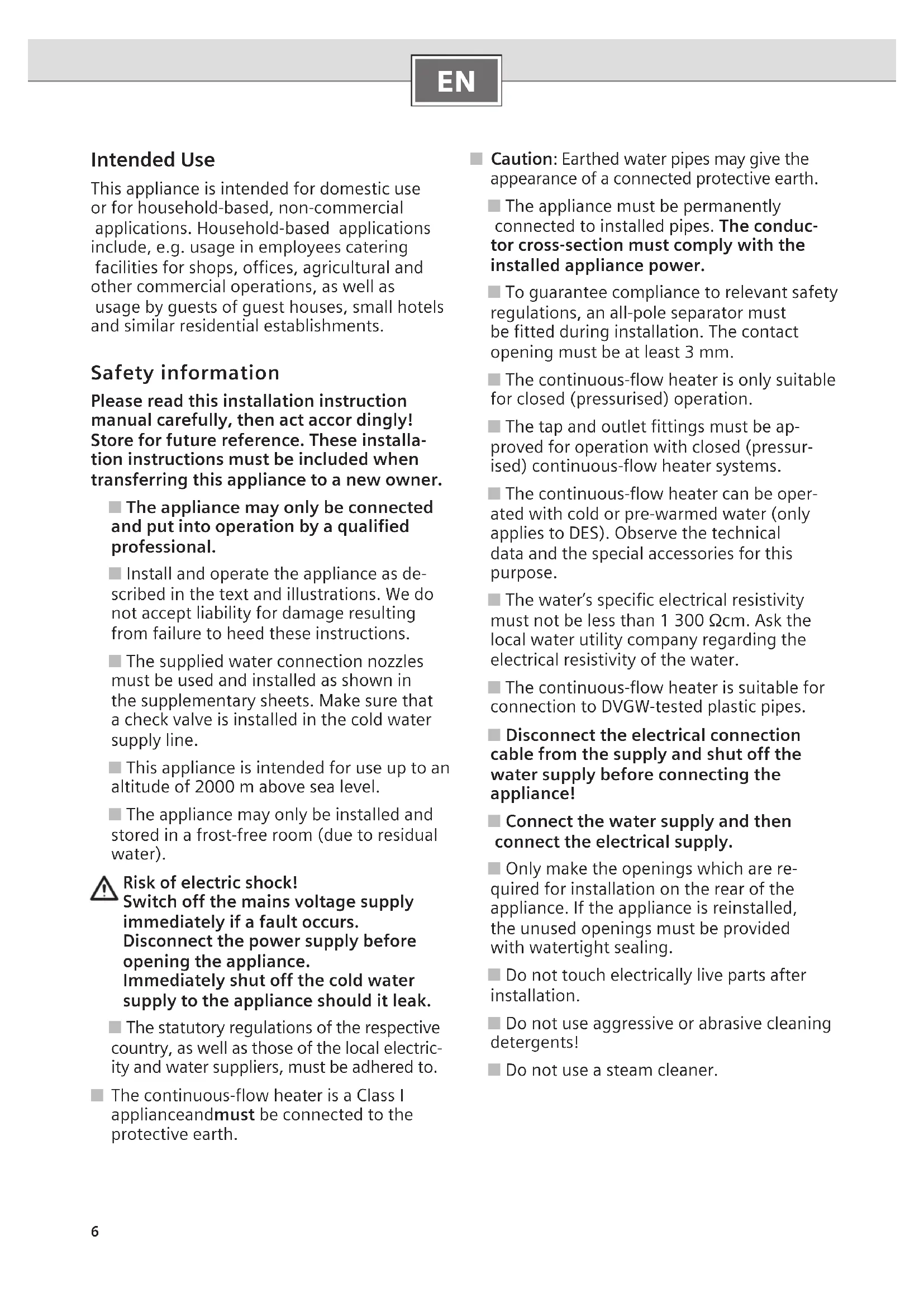 Intended Use This appliance is intended for domestic use or for household-based, non-commercial applications. Household-based applications include, e.g. usage in employees catering facilities for shops, offices, agricultural and other commercial operations, as well as usage by guests of guest houses, small hotels and similar residential establishments. Safety information Please read this installation instruction manual carefully, then act accor dingly! Store for future reference. These installa- tion instructions must be included when transferring this appliance to a new owner. ■ The appliance may only be connected and put into operation by a qualified professional. ■ Install and operate the appliance as de- scribed in the text and illustrations. We do not accept liability for damage resulting from failure to heed these instructions. ■ The supplied water connection nozzles must be used and installed as shown in the supplementary sheets. Make sure that a check valve is installed in the cold water supply line. ■ This appliance is intended for use up to an altitude of 2000 m above sea level. ■ The appliance may only be installed and stored in a frost-free room (due to residual water). Risk of electric shock! Switch off the mains voltage supply immediately if a fault occurs. Disconnect the power supply before opening the appliance. Immediately shut off the cold water supply to the appliance should it leak. ■ The statutory regulations of the respective country, as well as those of the local electric- ity and water suppliers, must be adhered to. ■ The continuous-flow heater is a Class I appliance and must be connected to the protective earth. ■ Caution: Earthed water pipes may give the appearance of a connected protective earth. ■ The appliance must be permanently connected to installed pipes. The conduc- tor cross-section must comply with the installed appliance power. ■ To guarantee compliance to relevant safety regulations, an all-pole separator must be fitted during installation. The contact opening must be at least 3 mm. ■ The continuous-flow heater is only suitable for closed (pressurised) operation. ■ The tap and outlet fittings must be ap- proved for operation with closed (pressur- ised) continuous-flow heater systems. ■ The continuous-flow heater can be oper- ated with cold or pre-warmed water (only applies to DES). Observe the technical data and the special accessories for this purpose. ■ The water’s specific electrical resistivity must not be less than 1 300 Ωcm. Ask the local water utility company regarding the electrical resistivity of the water. ■ The continuous-flow heater is suitable for connection to DVGW-tested plastic pipes. ■ Disconnect the electrical connection cable from the supply and shut off the water supply before connecting the appliance! ■ Connect the water supply and then connect the electrical supply. ■ Only make the openings which are re- quired for installation on the rear of the appliance. If the appliance is reinstalled, the unused openings must be provided with watertight sealing. ■ Do not touch electrically live parts after installation. ■ Do not use aggressive or abrasive cleaning detergents! ■ Do not use a steam cleaner.7