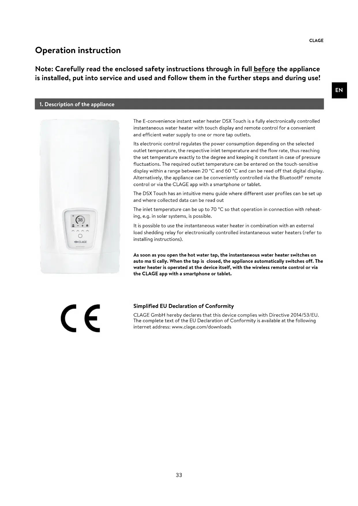 remote control or via the CLAGE app with a smartphone or tablet. The DSX Touch has an intuitive menu guide where different user profiles can be set up and where collected data can be read out The inlet temperature can be up to 70 °C so that operation in connection with reheat- ing, e.g. in solar systems, is possible. It is possible to use the instantaneous water heater in combination with an external load shedding relay for electronically controlled instantaneous water heaters (refer to installing instructions). Operation instruction Note: Carefully read the enclosed safety instructions through in full before the appliance is installed, put into service and used and follow them in the further steps and during use! Simplified EU Declaration of Conformity CLAGE GmbH hereby declares that this device complies with Directive 2014/53/EU. The complete text of the EU Declaration of Conformity is available at the following internet address: www.clage.com/downloads34