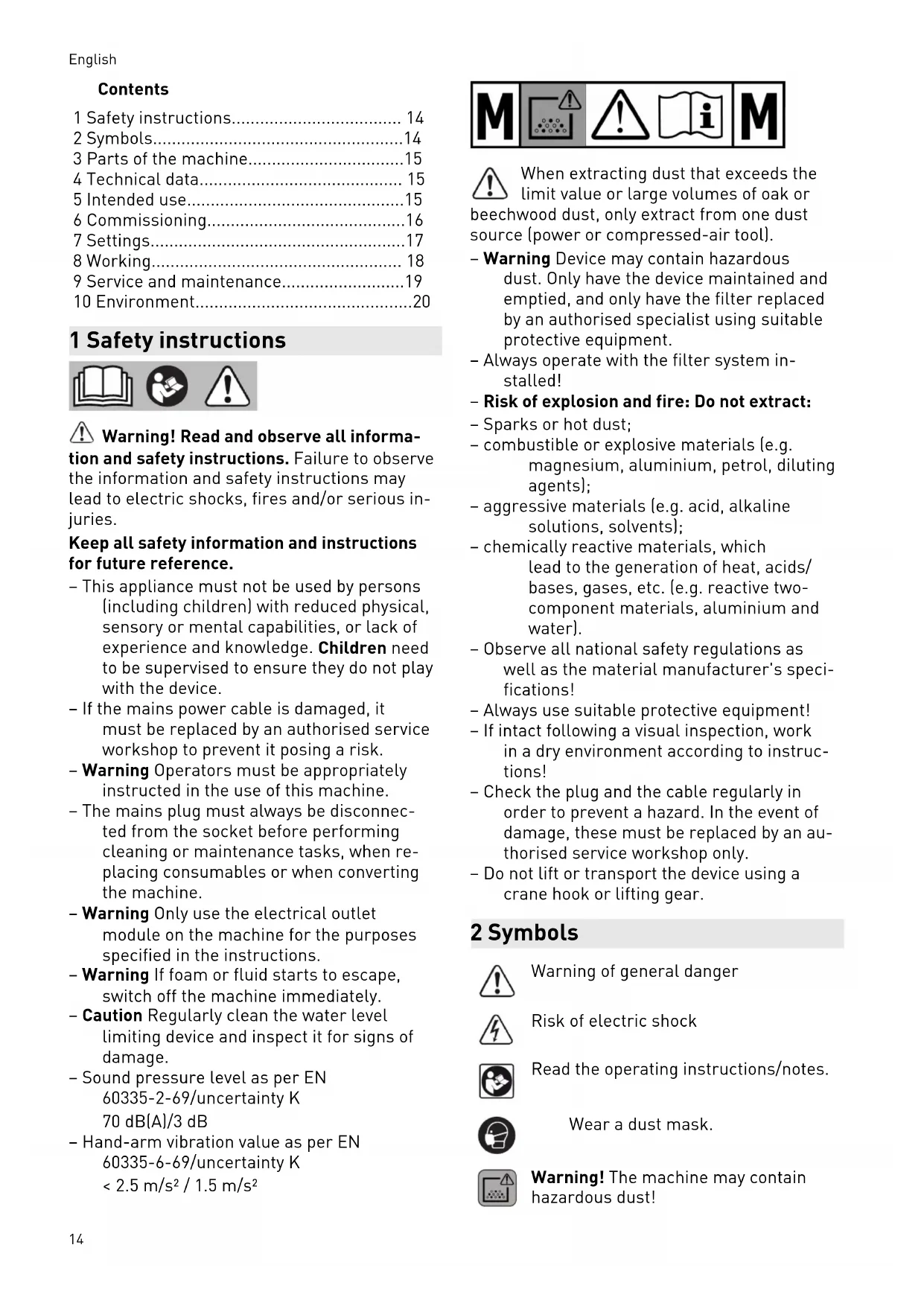- 10 Environment 1 Safety instructions Warning! Read and observe all informa tion and safety instructions. Failure to observe the information and safety instructions may lead to electric shocks, fires and/or serious in juries. Keep all safety information and instructions for future reference. – This appliance must not be used by persons (including children) with reduced physical, sensory or mental capabilities, or lack of experience and knowledge. Children need to be supervised to ensure they do not play with the device. – If the mains power cable is damaged, it must be replaced by an authorised service workshop to prevent it posing a risk. – Warning Operators must be appropriately instructed in the use of this machine. – The mains plug must always be disconnec ted from the socket before performing cleaning or maintenance tasks, when re placing consumables or when converting the machine. – Warning Only use the electrical outlet module on the machine for the purposes specified in the instructions. – Warning If foam or fluid starts to escape, switch off the machine immediately. – Caution Regularly clean the water level limiting device and inspect it for signs of damage. – Sound pressure level as per EN 60335-2-69/uncertainty K 70 dB(A)/3 dB – Hand-arm vibration value as per EN 60335-6-69/uncertainty K < 2.5 m/s² / 1.5 m/s² When extracting dust that exceeds the limit value or large volumes of oak or beechwood dust, only extract from one dust source (power or compressed-air tool). – Warning Device may contain hazardous dust. Only have the device maintained and emptied, and only have the filter replaced by an authorised specialist using suitable protective equipment. – Always operate with the filter system in stalled! – Risk of explosion and fire: Do not extract: – Sparks or hot dust; – combustible or explosive materials (e.g. magnesium, aluminium, petrol, diluting agents); – aggressive materials (e.g. acid, alkaline solutions, solvents); – chemically reactive materials, which lead to the generation of heat, acids/ bases, gases, etc. (e.g. reactive two- component materials, aluminium and water). – Observe all national safety regulations as well as the material manufacturer's speci fications! – Always use suitable protective equipment! – If intact following a visual inspection, work in a dry environment according to instruc tions! – Check the plug and the cable regularly in order to prevent a hazard. In the event of damage, these must be replaced by an au thorised service workshop only. – Do not lift or transport the device using a crane hook or lifting gear. 2 Symbols Warning of general danger Risk of electric shock Read the operating instructions/notes. Wear a dust mask. Warning! The machine may contain hazardous dust! English 14Suitable for separation of dust with an exposure limit value greater than 0,1 mg/m p. 20