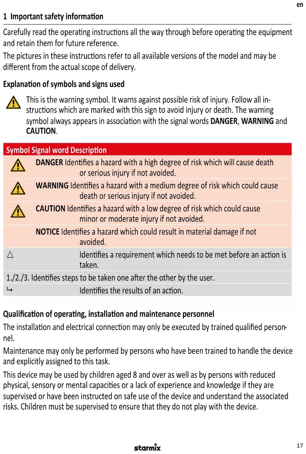 1 Important safety informaon Carefully read the operang instrucons all the way through before operang the equipment and retain them for future reference. The pictures in these instrucons refer to all available versions of the model and may be dierent from the actual scope of delivery. Explanaon of symbols and signs used This is the warning symbol. It warns against possible risk of injury. Follow all in- strucons which are marked with this sign to avoid injury or death. The warning symbol always appears in associaon with the signal words DANGER, WARNING and CAUTION. Symbol Signal word Descripon DANGER Idenes a hazard with a high degree of risk which will cause death or serious injury if not avoided. WARNING Idenes a hazard with a medium degree of risk which could cause death or serious injury if not avoided. CAUTION Idenes a hazard with a low degree of risk which could cause minor or moderate injury if not avoided. NOTICE Idenes a hazard which could result in material damage if not avoided.