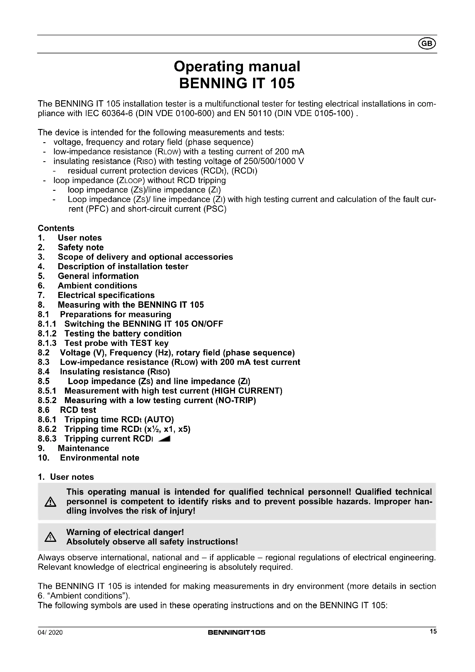 Operating manual BENNING IT 105 The BENNING IT 105 installation tester is a multifunctional tester for testing electrical installations in com- pliance with IEC 60364-6 (DIN VDE 0100-600) and EN 50110 (DIN VDE 0105-100) . The device is intended for the following measurements and tests: - voltage, frequency and rotary field (phase sequence) - low-impedance resistance (RLOW) with a testing current of 200 mA - insulating resistance (RISO) with testing voltage of 250/500/1000 V - residual current protection devices (RCDt), (RCDI) - loop impedance (ZLOOP) without RCD tripping - loop impedance (ZS)/line impedance (ZI) - Loop impedance (ZS)/ line impedance (ZI) with high testing current and calculation of the fault cur- rent (PFC) and short-circuit current (PSC) Contents