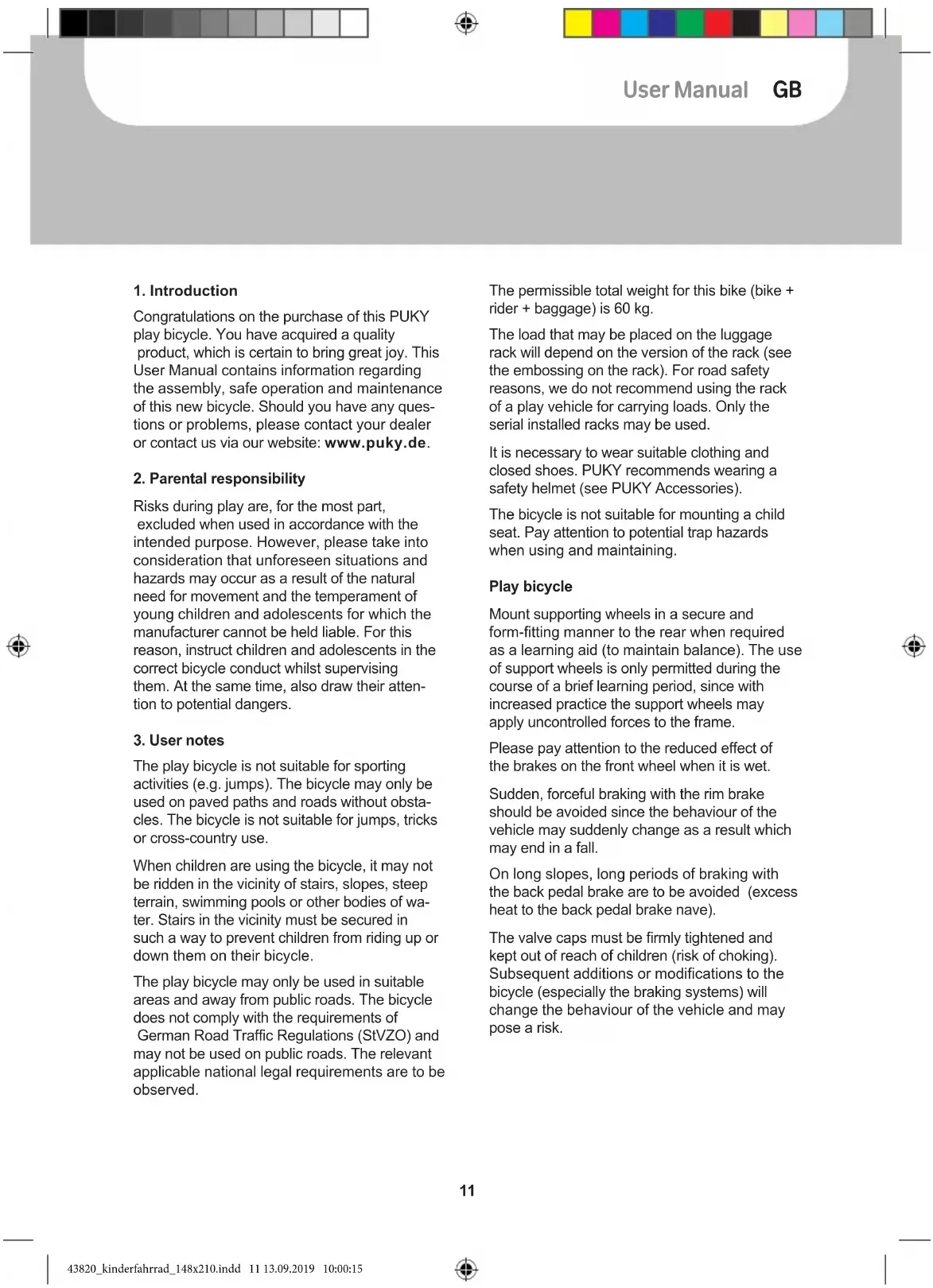 The play bicycle is not suitable for sporting activities (e.g. jumps). The bicycle may only be used on paved paths and roads without obsta- cles. The bicycle is not suitable for jumps, tricks or cross-country use. When children are using the bicycle, it may not be ridden in the vicinity of stairs, slopes, steep terrain, swimming pools or other bodies of wa- ter. Stairs in the vicinity must be secured in such a way to prevent children from riding up or down them on their bicycle. The play bicycle may only be used in suitable areas and away from public roads. The bicycle does not comply with the requirements of German Road Traffic Regulations (StVZO) and may not be used on public roads. The relevant applicable national legal requirements are to be observed. The permissible total weight for this bike (bike + rider + baggage) is 60 kg. The load that may be placed on the luggage rack will depend on the version of the rack (see the embossing on the rack). For road safety reasons, we do not recommend using the rack of a play vehicle for carrying loads. Only the serial installed racks may be used. It is necessary to wear suitable clothing and closed shoes. PUKY recommends wearing a safety helmet (see PUKY Accessories). The bicycle is not suitable for mounting a child seat. Pay attention to potential trap hazards when using and maintaining. Play bicycle Mount supporting wheels in a secure and form-fitting manner to the rear when required as a learning aid (to maintain balance). The use of support wheels is only permitted during the course of a brief learning period, since with increased practice the support wheels may apply uncontrolled forces to the frame. Please pay attention to the reduced effect of the brakes on the front wheel when it is wet. Sudden, forceful braking with the rim brake should be avoided since the behaviour of the vehicle may suddenly change as a result which may end in a fall. On long slopes, long periods of braking with the back pedal brake are to be avoided (excess heat to the back pedal brake nave). The valve caps must be firmly tightened and kept out of reach of children (risk of choking). Subsequent additions or modifications to the bicycle (especially the braking systems) will change the behaviour of the vehicle and may pose a risk. 43820_kinderfahrrad_148x210.indd 11 13.09.2019 10:00:1512 Children‘s bike User Manual