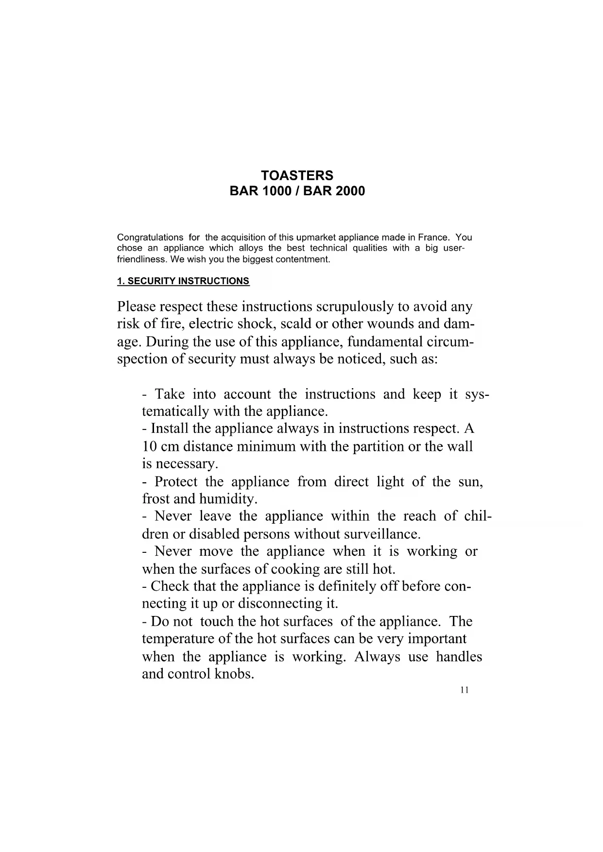 Device: A toaster with protecting grids Accessories: - One tray - One cooking grid (BAR 1000) - Two cooking grids (BAR 2000) - One grid holder handle (BAR 1000 / BAR 2000) - The present note Option : Sandwich tong See exploded views for BAR 1000 / BAR 2000 at the end of the document