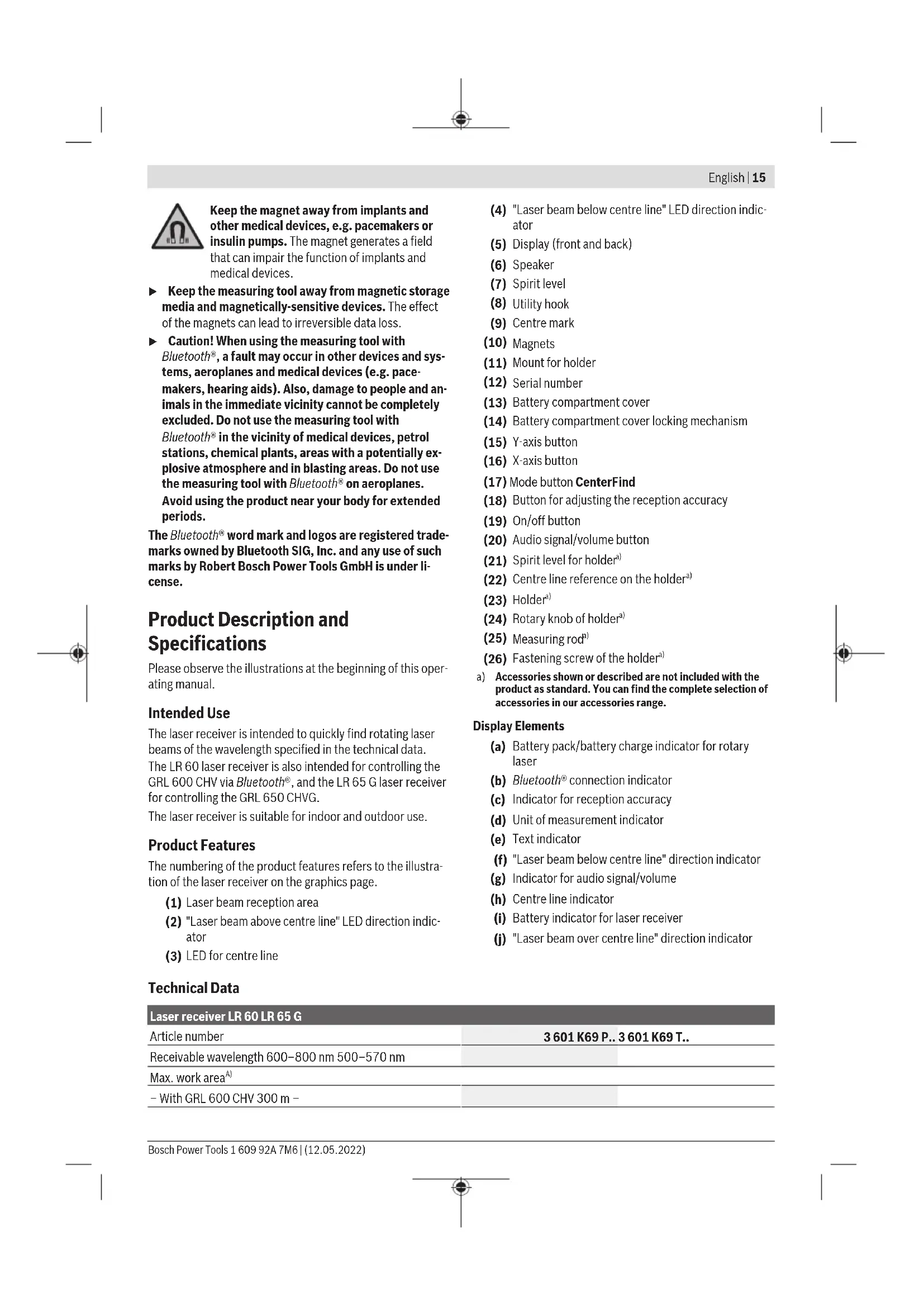 Accessories shown or described are not included with the product as standard. You can find the complete selection of accessories in our accessories range. Display Elements (a) Battery pack/battery charge indicator for rotary laser (b) Bluetooth® connection indicator (c) Indicator for reception accuracy (d) Unit of measurement indicator (e) Text indicator (f) "Laser beam below centre line" direction indicator (g) Indicator for audio signal/volume (h) Centre line indicator (i) Battery indicator for laser receiver (j) "Laser beam over centre line" direction indicator Technical Data Laser receiver LR 60 LR 65G Article number 3601K69P.. 3601K69T.. Receivable wavelength 600–800nm 500–570nm Max. work area