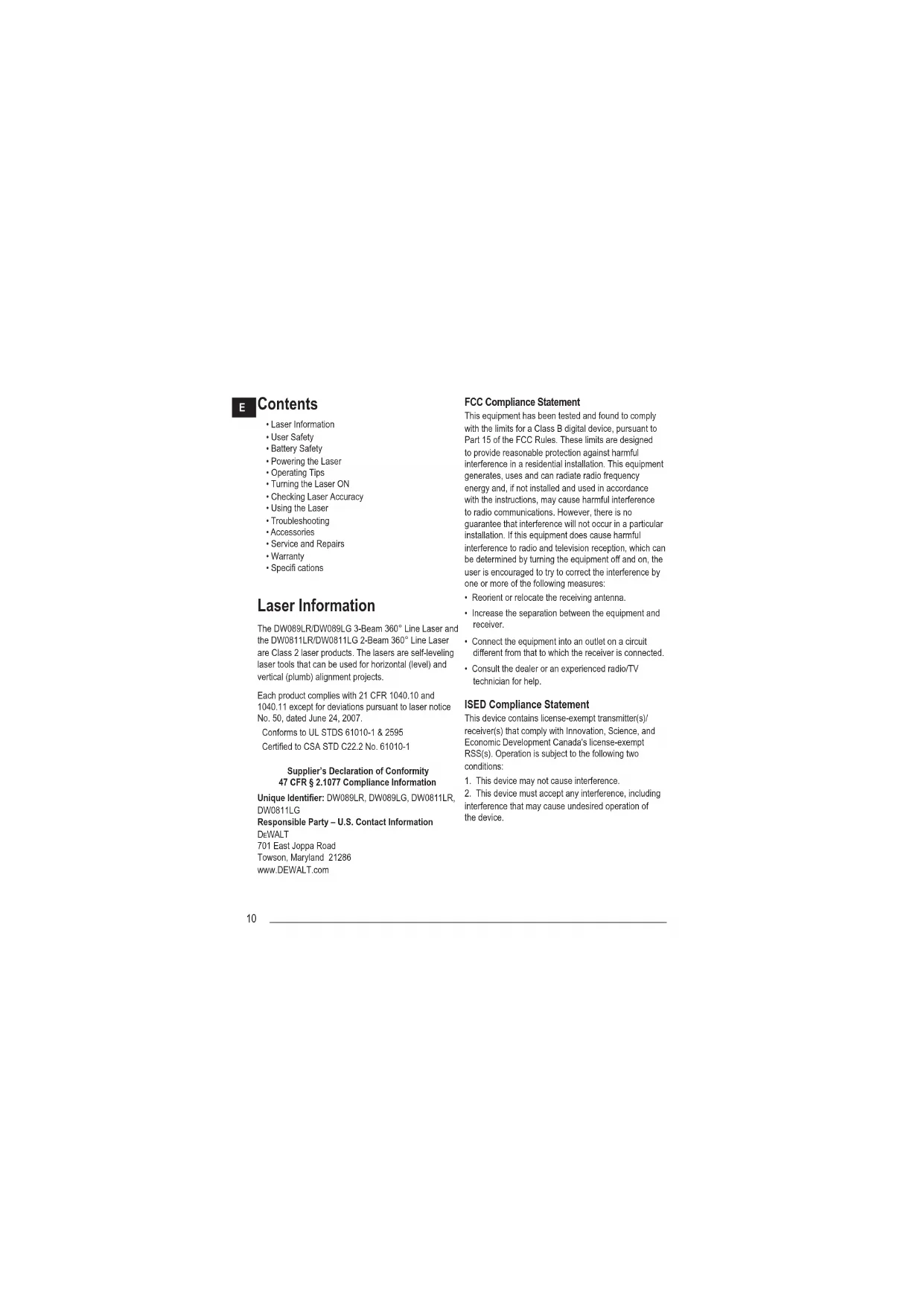 - Specifi cations Laser Information The DW089LR/DW089LG 3-Beam 360° Line Laser and the DW0811LR/DW0811LG 2-Beam 360° Line Laser are Class 2 laser products. The lasers are self-leveling laser tools that can be used for horizontal (level) and vertical (plumb) alignment projects. Each product complies with 21 CFR 1040.10 and 1040.11 except for deviations pursuant to laser notice No. 50, dated June 24, 2007. Conforms to UL STDS 61010-1 & 2595 Certified to CSA STD C22.2 No. 61010-1 Supplier’s Declaration of Conformity 47 CFR § 2.1077 Compliance Information Unique Identifi er: DW089LR, DW089LG, DW0811LR, DW0811LG Responsible Party – U.S. Contact Information