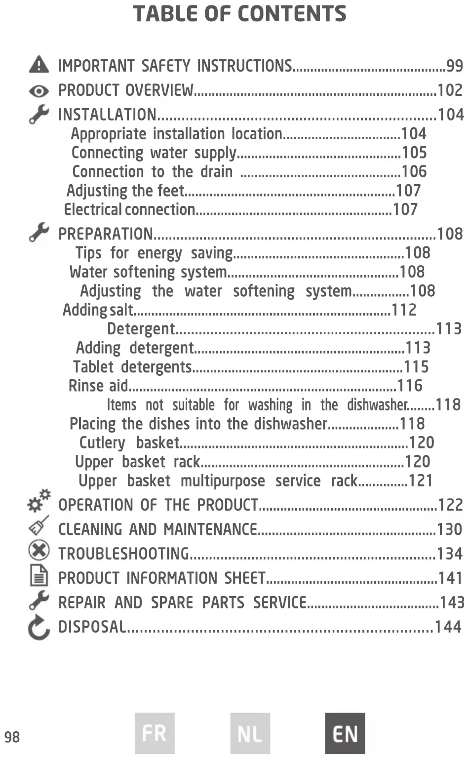 - Regarding the detailed instructions on how to load the100 dishwasher, refer to the section “Placing the dishes into the dishwasher” in pages 118-119.