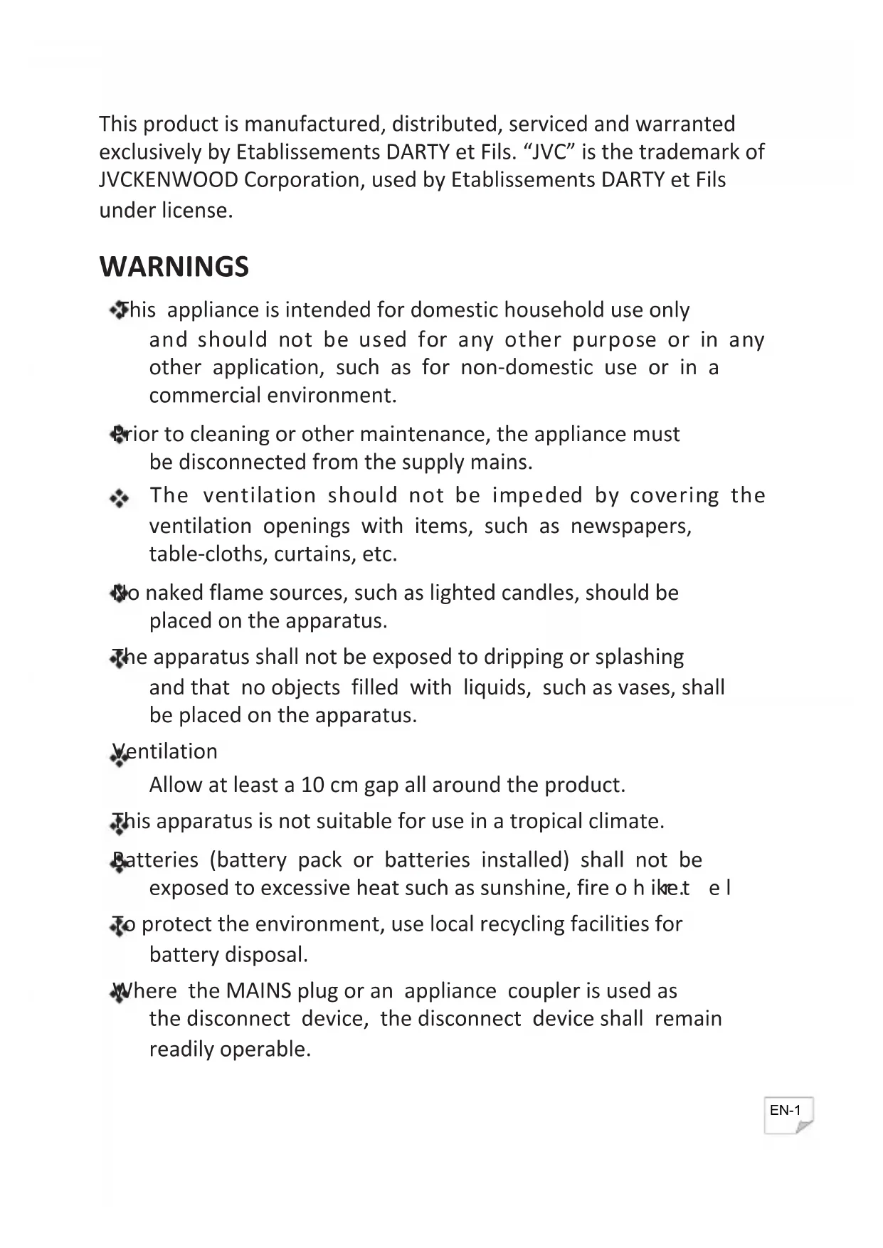 Do not attempt to open the product. This product does not contain any user serviceable parts. Do not use your clock radio near emergency/intensive care medical equipment or If you have a pacemaker fitted or during the electrical storm. EN-2