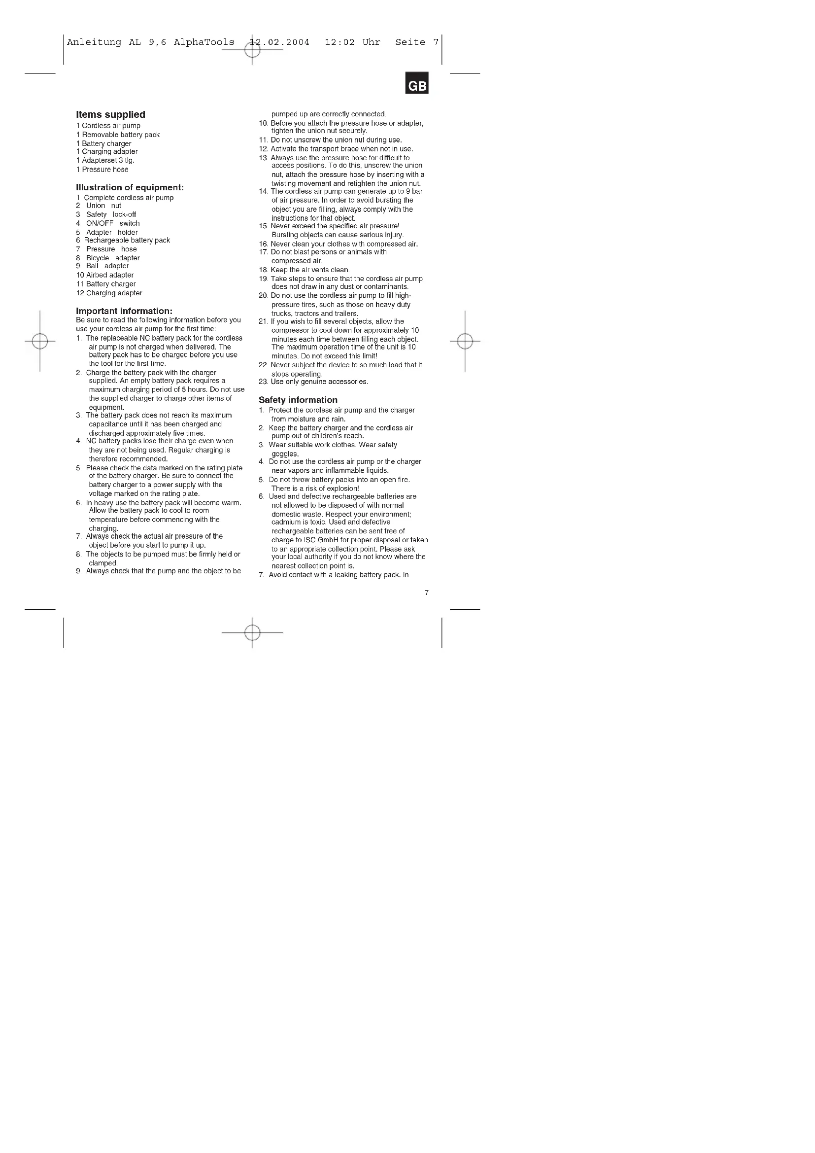 adapter (Pos. 12). The green LED and the red LED will illuminate simultaneously and the battery will start charging. An empty battery pack requires a maximum charging period of 5 hours. The temperature of the battery pack may rise slightly during the charging operation. This is normal. Important! It does not switch off automatically when fully charged! If the battery pack fails to charge, please check whether there is voltage at the socket-outlet whether there is good contact at the charging contacts of the battery station (pos. 12) If the battery pack still fails to charge, please send the battery charger and charging adapter the battery pack to our customer services department. To ensure that the NC battery pack provides long service, you should take care to recharge it promptly. You must recharge the battery pack when you notice that the power of the cordless air pump drops. Never fully discharge the battery pack. This will cause it to develop a defect! ON/OFF switch Insert the charged battery in the handle until it locks into place. Deactivate the transport brace (Pos. 3). To do this, slide the slide button to its position on the right (lock is open). Switch the device on and off with the ON/OFF switch (Pos. 4). Important! A force of over 60N exerted on the ON/OFF switch may cause the device to switch on in spite of the transport brace! Pumping up: Important! The in-built pressure manometer is not calibrated. After you have pumped up a tire, therefore, you will have to check the air pressure using a calibrated air gauge. Pumping up vehicle tires Attach the cordless air pump to the valve either directly or with the pressure hose (Pos. 7). Pumping up bicycle tires To pump up bicycle tires with conventional valves, screw the adapter (Pos. 8) onto the valve. Attach the cordless air pump to the adapter or screw the pressure hose onto the adapter, then pump up the bicycle tire. For bicycles with car valves, attach the cordless air pump to the valve either directly or with the pressure hose (Pos. 7). Pumping up other objects To pump up leisure, sports and beach articles, use the ball adapter (Pos. 9) or airbed adapter (Pos. 10). In doing so, take care to comply with the instructions for use of the blow-up object! Care and maintenance Always remove the rechargeable battery from the device before starting any maintenance or repair