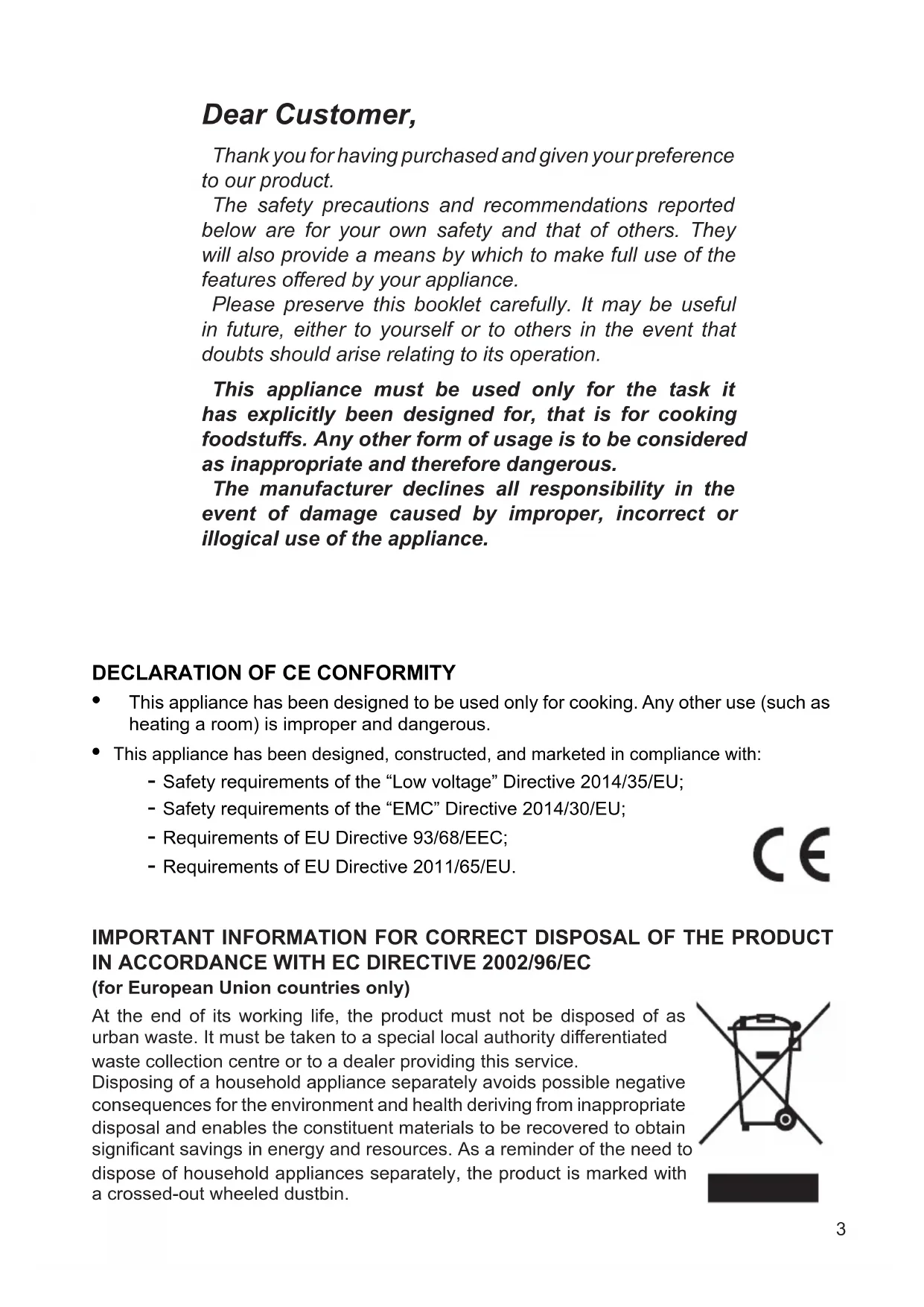 - This appliance has been designed, constructed, and marketed in compliance with: - Safety requirements of the “Low voltage” Directive 2014/35/EU; - Safety requirements of the “EMC” Directive 2014/30/EU; - Requirements of EU Directive 93/68/EEC; - Requirements of EU Directive 2011/65/EU. IMPORTANT INFORMATION FOR CORRECT DISPOSAL OF THE PRODUCT