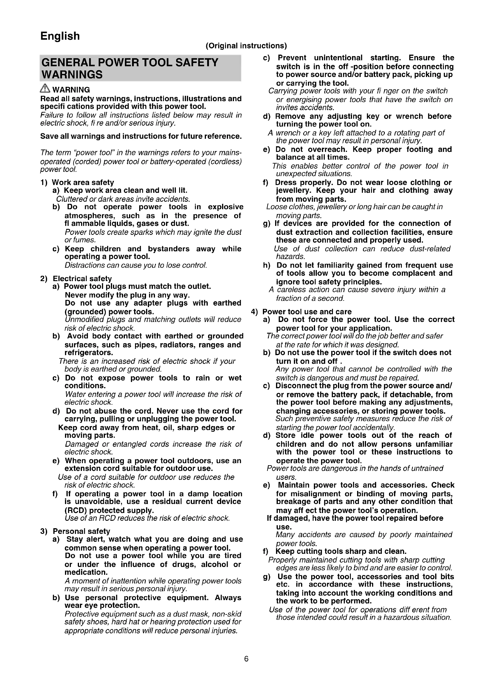 0000BookWR36DF.indb50000BookWR36DF.indb5 2022/10/1618:10:462022/10/1618:10:466 English c) Prevent unintentional starting. Ensure the switch is in the off -position before connecting to power source and/or battery pack, picking up or carrying the tool. Carrying power tools with your fi nger on the switch or energising power tools that have the switch on invites accidents. d) Remove any adjusting key or wrench before turning the power tool on. A wrench or a key left attached to a rotating part of the power tool may result in personal injury. e) Do not overreach. Keep proper footing and balance at all times. This enables better control of the power tool in unexpected situations. f) Dress properly. Do not wear loose clothing or jewellery. Keep your hair and clothing away from moving parts. Loose clothes, jewellery or long hair can be caught in moving parts. g) If devices are provided for the connection of dust extraction and collection facilities, ensure these are connected and properly used. Use of dust collection can reduce dust-related hazards. h) Do not let familiarity gained from frequent use of tools allow you to become complacent and ignore tool safety principles. A careless action can cause severe injury within a fraction of a second.