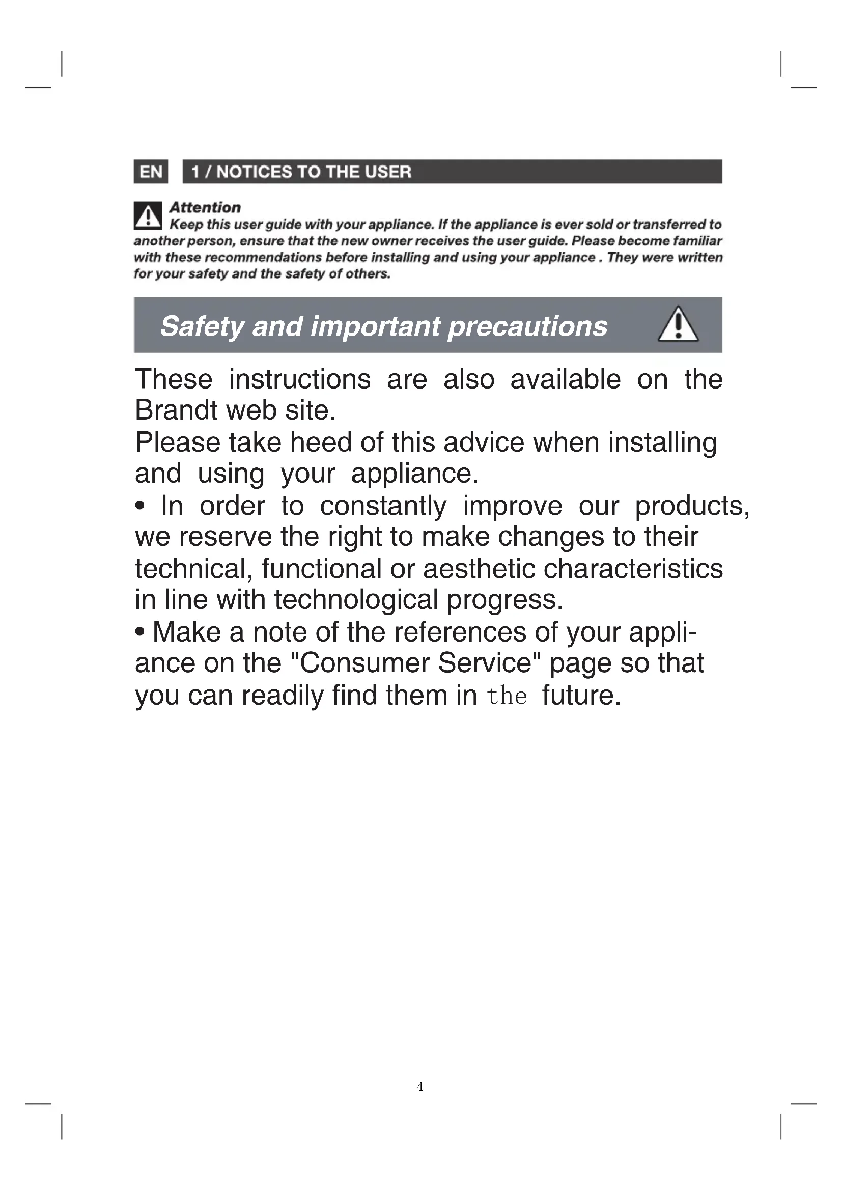 - Installing your cooker hood ___________________________________ 11 3Safety and important precautions These instructions are also available on the Brandt web site. Please take heed of this advice when installing and using your appliance.