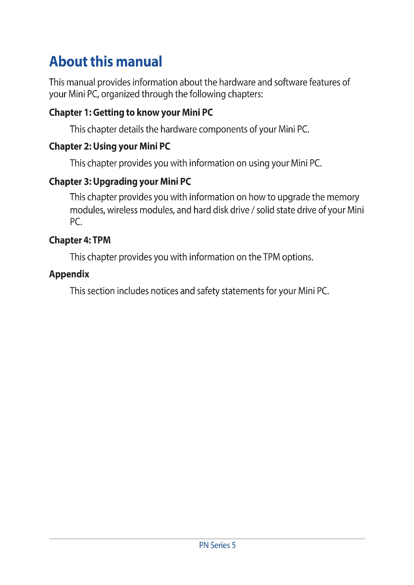 This chapter provides you with information on the TPM options. Appendix This section includes notices and safety statements for your Mini PC.6 PN Series Conventions used in this manual To highlight key information in this manual, some text are presented as follows: IMPORTANT! This message contains vital information that must be followed to complete a task. NOTE: This message contains additional information and tips that can help complete tasks. WARNING! This message contains important information that must be followed to keep you safe while performing certain tasks and prevent damage to your Mini PC's data and components.PN Series 7 Package contents Your Mini PC package contains the following items: ASUS Mini PC PN Series AC power adapter* Power cord* Technical documentation8 PN Series NOTE:
