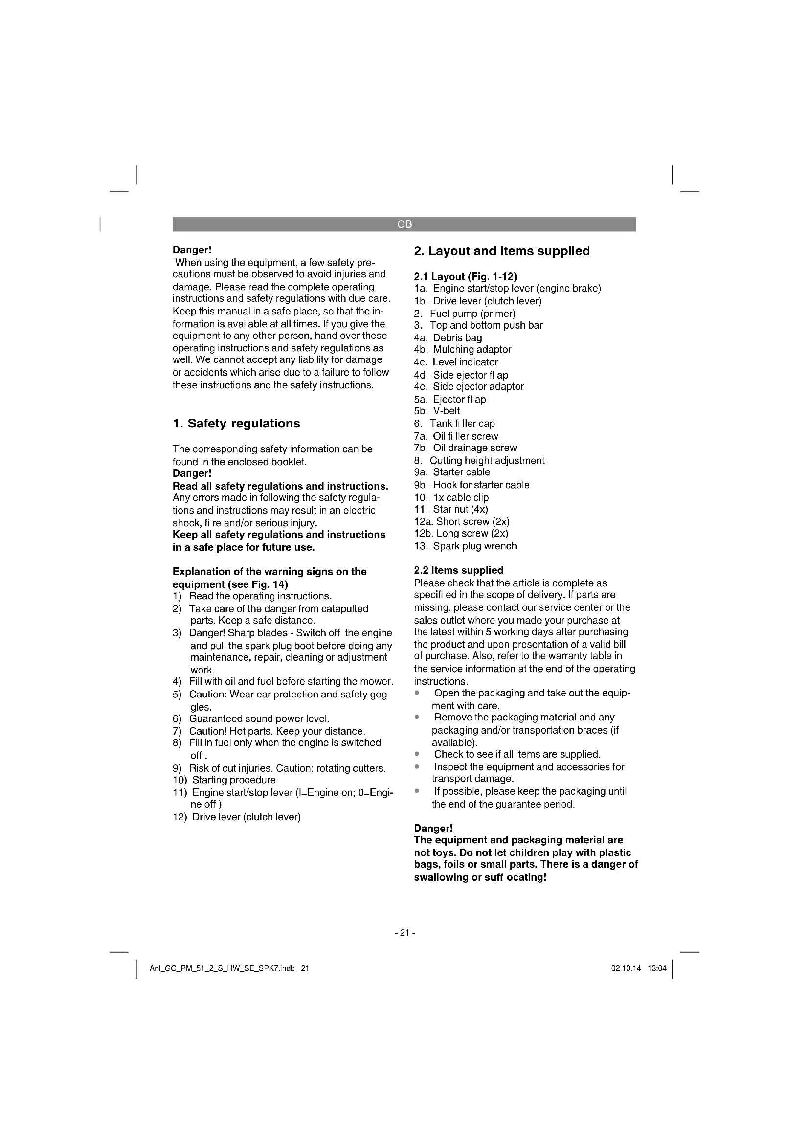 the spark plug. Carrying out a safety test on the engine start/ stop lever The lawn mower comes equipped with an engi- ne start/stop lever (Fig. 5a/Item 1a) in order to prevent it from starting up unintentionally and to ensure that the engine and blade stop quickly in case of danger. The lever must be actuated (Fig. 5b) before the lawn mower is started. When the engine start/stop lever is released, it must return to its initial position (Fig. 5a). Before you start mowing, you should run through this process several times in order to ensure that the lever and actuator cables are working pro- perly. Repeat the test several times after the engine has started up. When the engine start/stop lever is released, the engine must stop within a few se- conds. If not, contact Customer Service. Anl_GC_PM_51_2_S_HW_SE_SPK7.indb 23Anl_GC_PM_51_2_S_HW_SE_SPK7.indb 23 02.10.14 13:0402.10.14 13:04GB