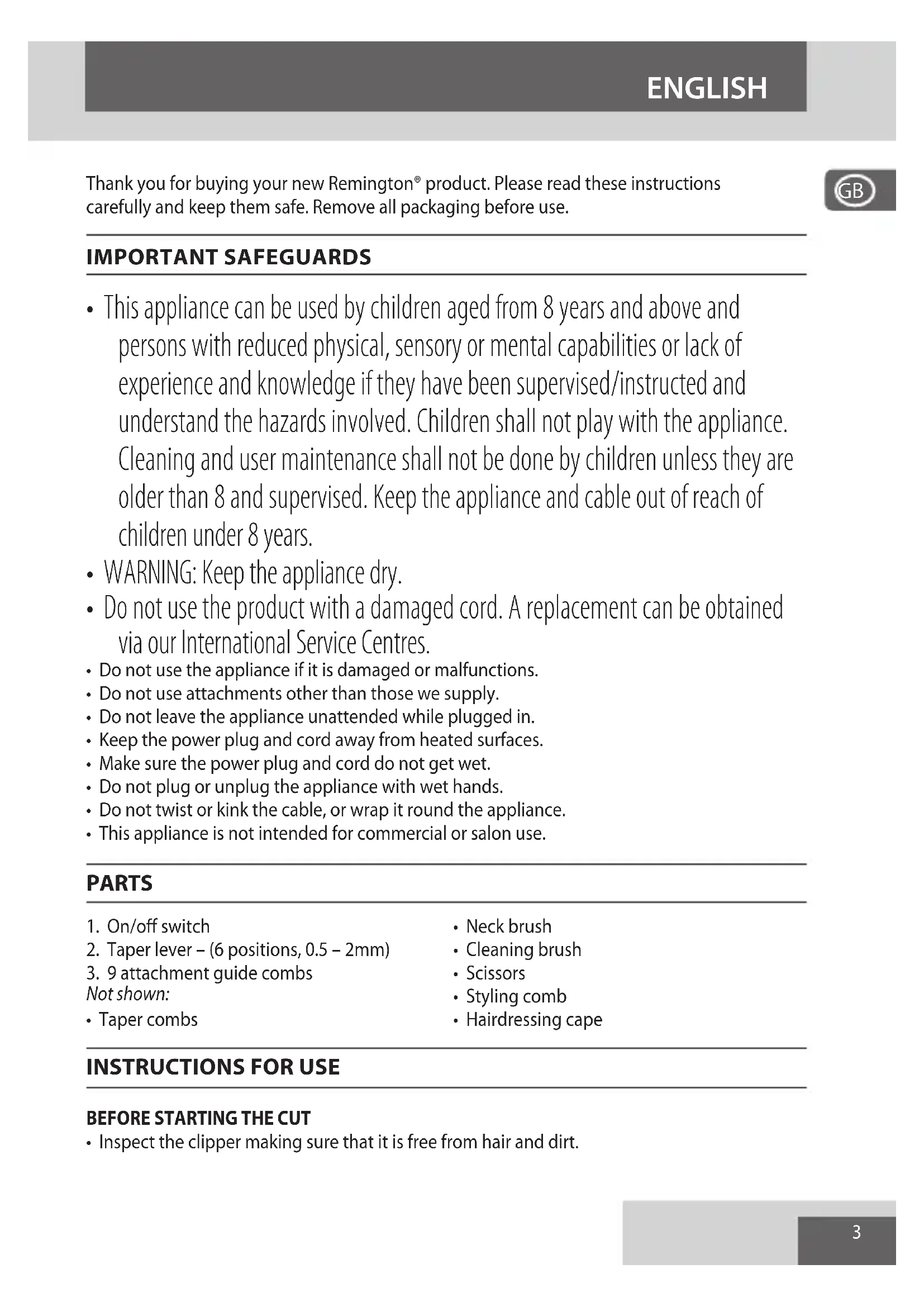 Thank you for buying your new Remington® product. Please read these instructions carefully and keep them safe. Remove all packaging before use. IMPORTANT SAFEGUARDS