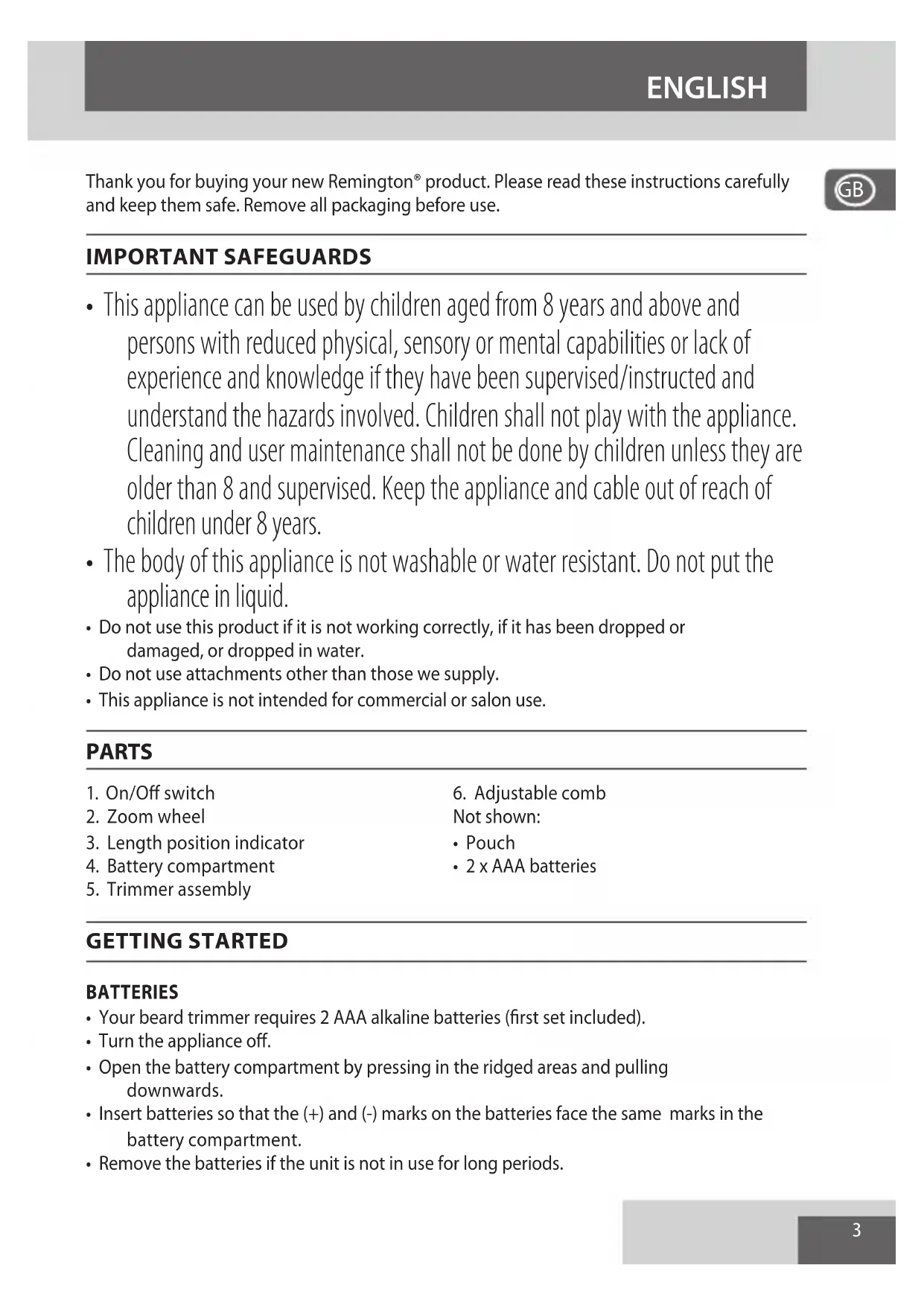 AAA3 ENGLISH Thank you for buying your new Remington® product. Please read these instructions carefully and keep them safe. Remove all packaging before use. IMPORTANT SAFEGUARDS