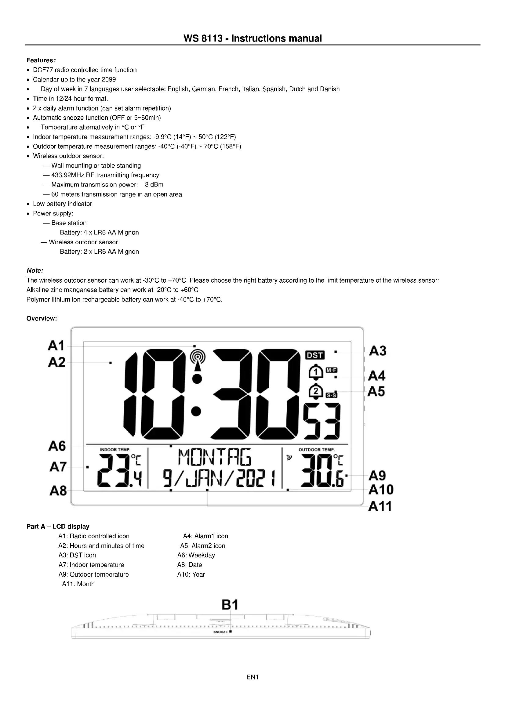 Part A – LCD display A1: Radio controlled icon A4: Alarm1 icon A2: Hours and minutes of time A5: Alarm2 icon A3: DST icon A6: Weekday A7: Indoor temperature A8: Date A9: Outdoor temperature A10: Year A11: MonthEN2