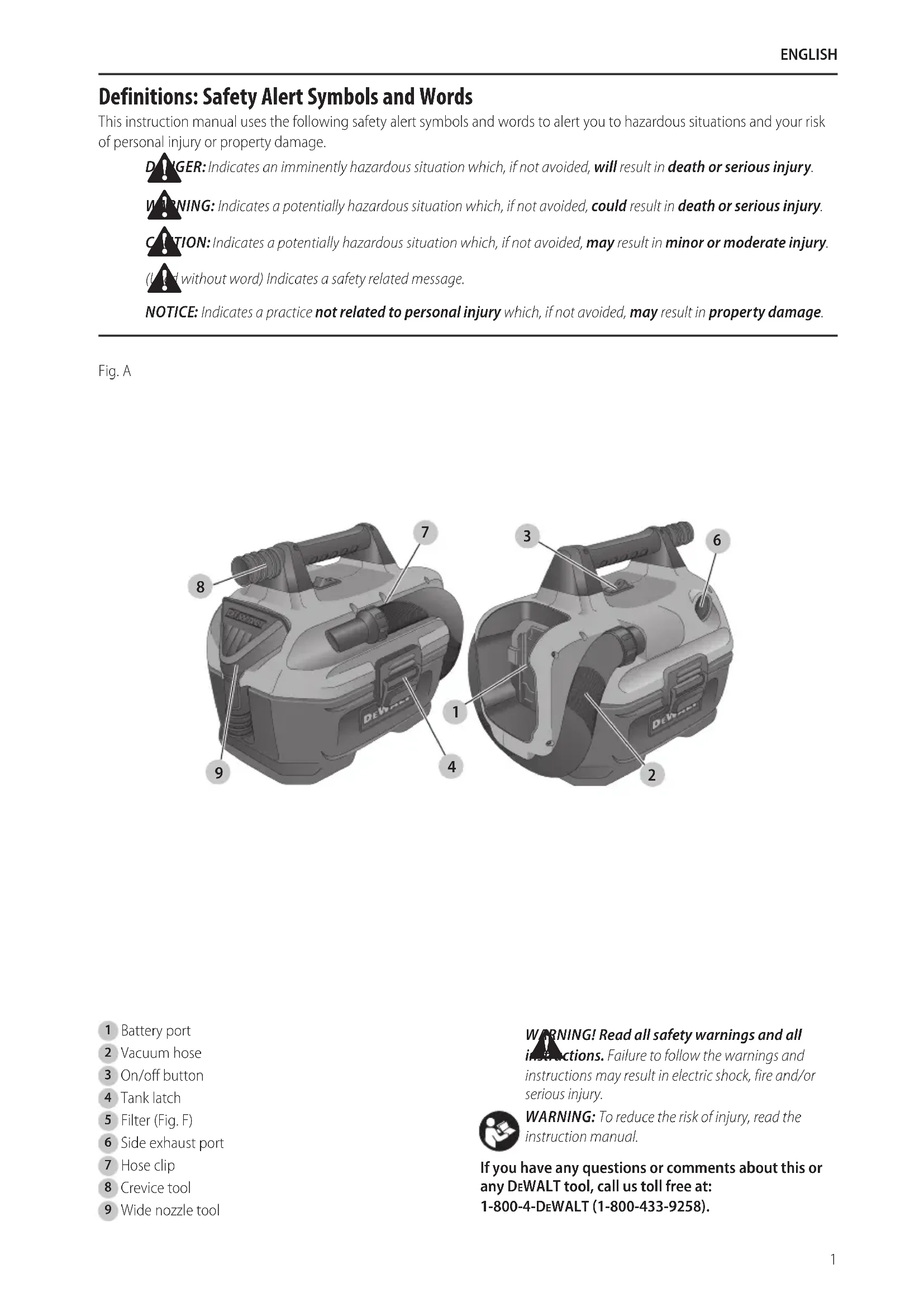 offered by DeWALT, have not been tested with this product, use of such accessories with this tool could be hazardous. To reduce the risk of injury, only DeWALT recommended accessories should be used with thisproduct. Recommended accessories for use with your tool are available at extra cost from your local dealer or authorized service center. If you need assistance in locating any accessory, please contact DeWALT Industrial Tool Co., 701East Joppa Road, Towson, MD 21286, call 1-800-4-DeWALT (1-800-433-9258) or visit our website: www.dewalt.com. The DCV580h includes a 1–1/4" hose, crevice tool (stored in the handle) and widenozzle. A replacement filter is available at extra cost at your local DeWALT servicecenter. Dust Collector (Fig.G) In the vacuum mode, the appliance can also function as a dust collector for power tool applications producing dust ordebris. Install the DWV9000 dust extraction adaptor, available at additional cost, to facilitate connection of a power tool to the vacuum hose