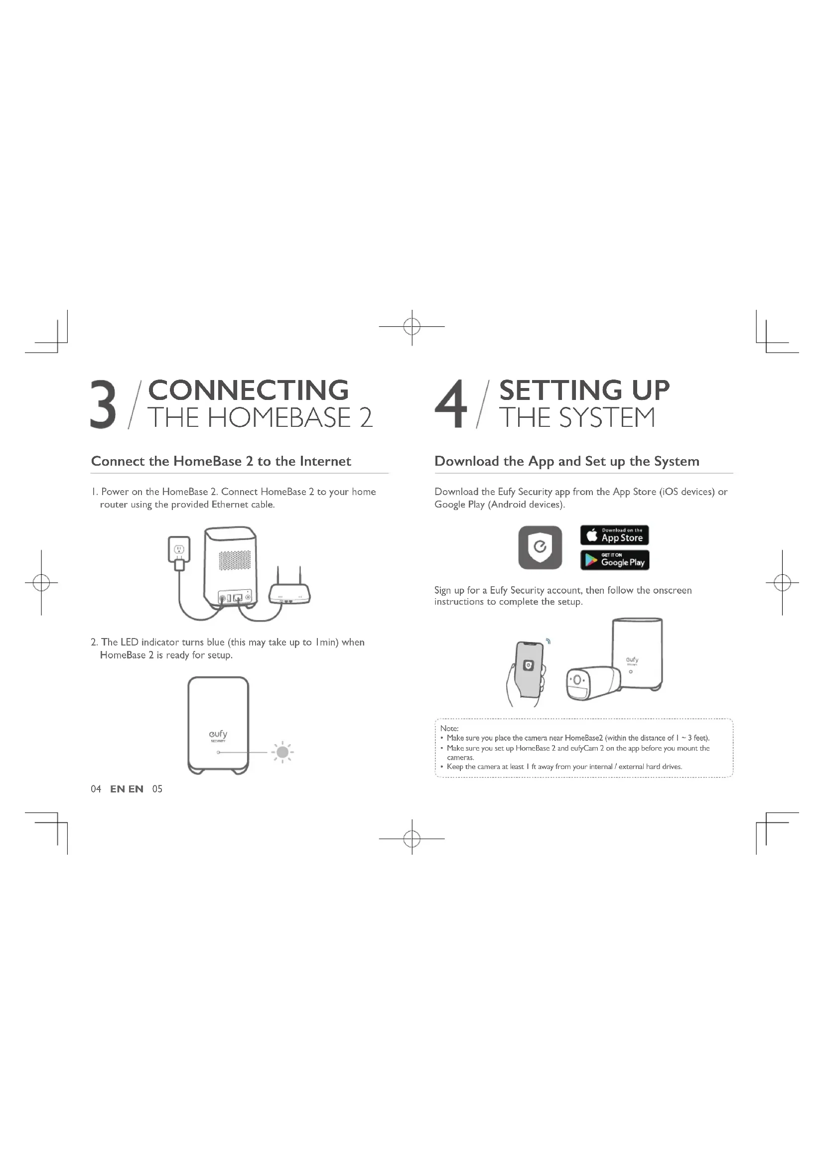 HomeBase 2 is ready for setup. SETTING UP THE SYSTEM Download the App and Set up the System Download the Eufy Security app from the App Store (iOS devices) or Google Play (Android devices). Sign up for a Eufy Security account, then follow the onscreen instructions to complete the setup. Note: