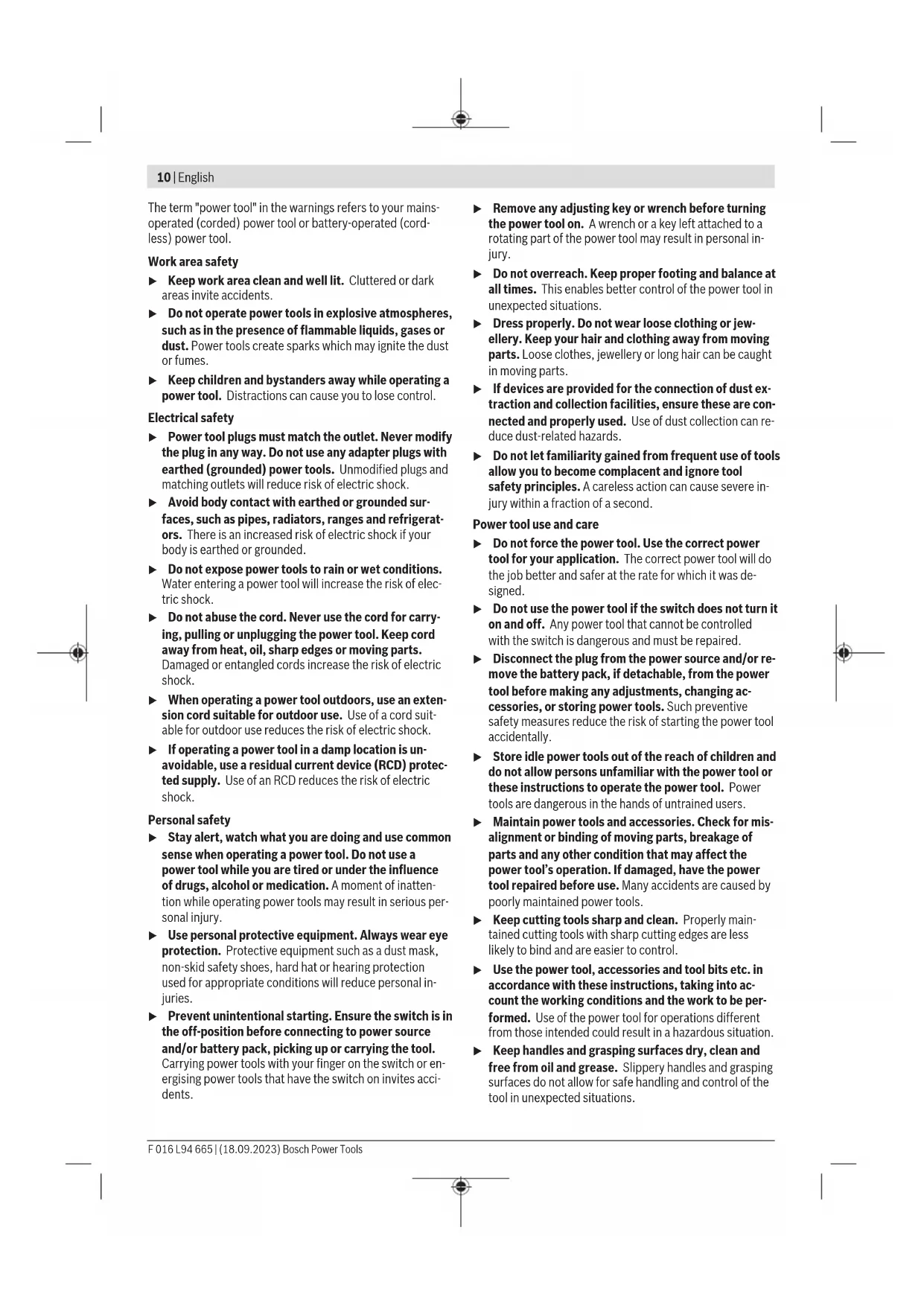 ance. General Power Tool Safety Warnings WARNING Read all safety warnings, instruc- tions, illustrations and specifica- tions provided with this power tool. Failure to follow all in- structions listed below may result in electric shock, fire and/ or serious injury. Save all warnings and instructions for future reference. Bosch Power Tools F 016 L94 665 | (18.09.2023)10 | English The term "power tool" in the warnings refers to your mains- operated (corded) power tool or battery-operated (cord- less) power tool. Work area safety u Keep work area clean and well lit. Cluttered or dark areas invite accidents. u Do not operate power tools in explosive atmospheres, such as in the presence of flammable liquids, gases or dust. Power tools create sparks which may ignite the dust or fumes. u Keep children and bystanders away while operating a power tool. Distractions can cause you to lose control. Electrical safety u Power tool plugs must match the outlet. Never modify the plug in any way. Do not use any adapter plugs with earthed (grounded) power tools. Unmodified plugs and matching outlets will reduce risk of electric shock. u Avoid body contact with earthed or grounded sur- faces, such as pipes, radiators, ranges and refrigerat- ors. There is an increased risk of electric shock if your body is earthed or grounded. u Do not expose power tools to rain or wet conditions. Water entering a power tool will increase the risk of elec- tric shock. u Do not abuse the cord. Never use the cord for carry- ing, pulling or unplugging the power tool. Keep cord away from heat, oil, sharp edges or moving parts. Damaged or entangled cords increase the risk of electric shock. u When operating a power tool outdoors, use an exten- sion cord suitable for outdoor use. Use of a cord suit- able for outdoor use reduces the risk of electric shock. u If operating a power tool in a damp location is un- avoidable, use a residual current device (RCD) protec- ted supply. Use of an RCD reduces the risk of electric shock. Personal safety u Stay alert, watch what you are doing and use common sense when operating a power tool. Do not use a power tool while you are tired or under the influence of drugs, alcohol or medication. A moment of inatten- tion while operating power tools may result in serious per- sonal injury. u Use personal protective equipment. Always wear eye protection. Protective equipment such as a dust mask, non-skid safety shoes, hard hat or hearing protection used for appropriate conditions will reduce personal in- juries. u Prevent unintentional starting. Ensure the switch is in the off-position before connecting to power source and/or battery pack, picking up or carrying the tool. Carrying power tools with your finger on the switch or en- ergising power tools that have the switch on invites acci- dents. u Remove any adjusting key or wrench before turning the power tool on. A wrench or a key left attached to a rotating part of the power tool may result in personal in- jury. u Do not overreach. Keep proper footing and balance at all times. This enables better control of the power tool in unexpected situations. u Dress properly. Do not wear loose clothing or jew- ellery. Keep your hair and clothing away from moving parts. Loose clothes, jewellery or long hair can be caught in moving parts. u If devices are provided for the connection of dust ex- traction and collection facilities, ensure these are con- nected and properly used. Use of dust collection can re- duce dust-related hazards. u Do not let familiarity gained from frequent use of tools allow you to become complacent and ignore tool safety principles. A careless action can cause severe in- jury within a fraction of a second. Power tool use and care u Do not force the power tool. Use the correct power tool for your application. The correct power tool will do the job better and safer at the rate for which it was de- signed. u Do not use the power tool if the switch does not turn it on and off. Any power tool that cannot be controlled with the switch is dangerous and must be repaired. u Disconnect the plug from the power source and/or re- move the battery pack, if detachable, from the power tool before making any adjustments, changing ac- cessories, or storing power tools. Such preventive safety measures reduce the risk of starting the power tool accidentally. u Store idle power tools out of the reach of children and do not allow persons unfamiliar with the power tool or these instructions to operate the power tool. Power tools are dangerous in the hands of untrained users. u Maintain power tools and accessories. Check for mis- alignment or binding of moving parts, breakage of parts and any other condition that may affect the power tool’s operation. If damaged, have the power tool repaired before use. Many accidents are caused by poorly maintained power tools. u Keep cutting tools sharp and clean. Properly main- tained cutting tools with sharp cutting edges are less likely to bind and are easier to control. u Use the power tool, accessories and tool bits etc. in accordance with these instructions, taking into ac- count the working conditions and the work to be per- formed. Use of the power tool for operations different from those intended could result in a hazardous situation. u Keep handles and grasping surfaces dry, clean and free from oil and grease. Slippery handles and grasping surfaces do not allow for safe handling and control of the tool in unexpected situations. F 016 L94 665 | (18.09.2023) Bosch Power ToolsEnglish | 11 Battery tool use and care u Recharge only with the charger specified by the manu- facturer. A charger that is suitable for one type of bat- tery pack may create a risk of fire when used with another battery pack. u Use power tools only with specifically designated bat- tery packs. Use of any other battery packs may create a risk of injury and fire. u When battery pack is not in use, keep it away from other metal objects, like paper clip