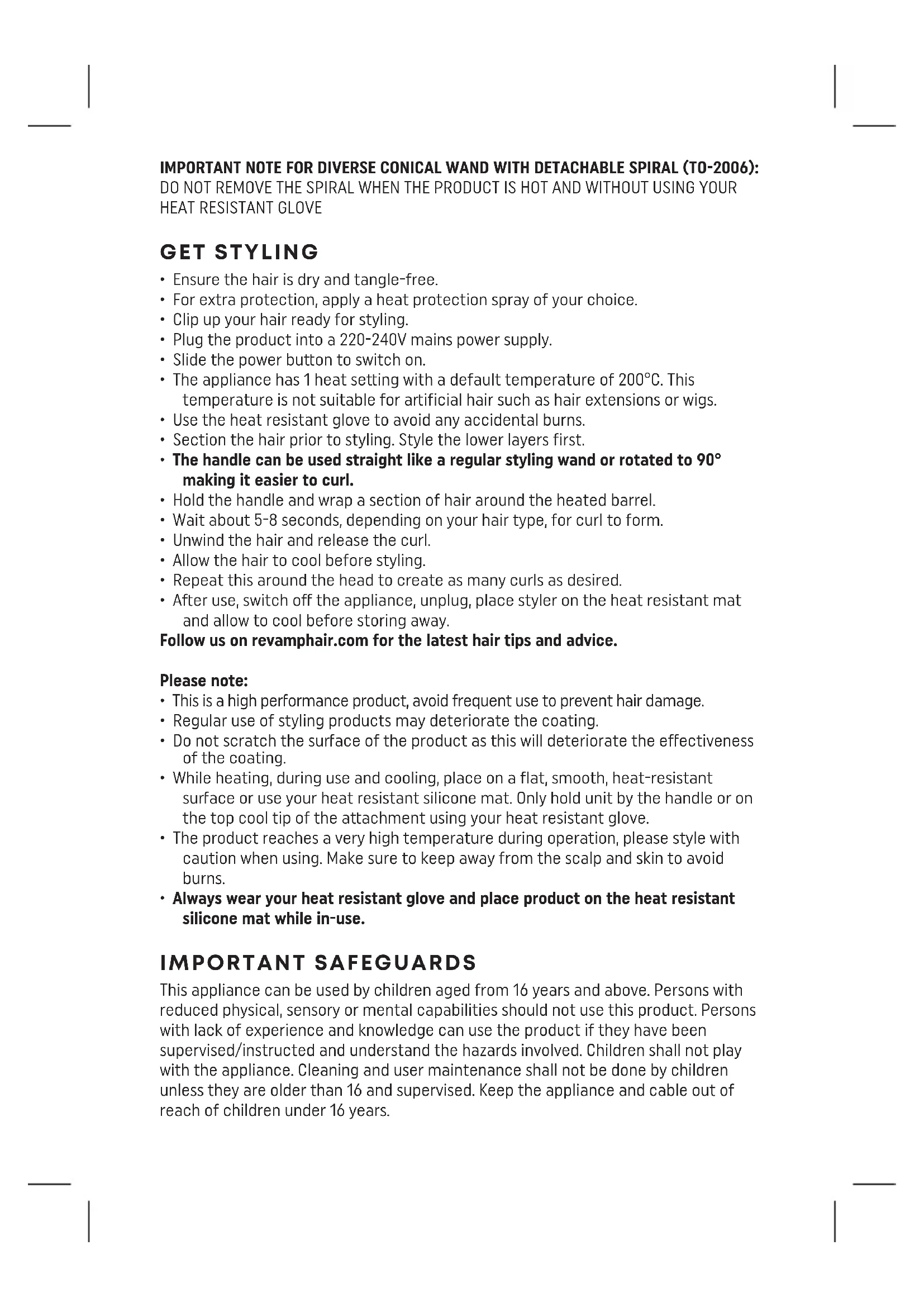 FKA Brands Ltd guarantees this product from defect in material and workmanship for a period of 2 years from the date of purchase, except as noted below. This FKA Brands Ltd product guarantee does not cover damage caused by misuse or abuse; accident; the aachment of any unauthorised accessory; alteration to the product; or any other conditions whatsoever that are beyond the control of FKA Brands Ltd. This guarantee is effective only if the product is purchased and operated in the UK / EU. A product that requires modification or adaptation to enable it to operate in any country other than the country for which it was designed, manufactured, approved and / or authorised, or repair of products damaged by these modifications is not covered under this guarantee. FKA Brands Ltd shall not be responsible for any type of incidental, consequential or special damages. To obtain guarantee service on your product, return the product post-paid to your local service centre along with your dated sales receipt (as proof of purchase). Upon receipt, FKA Brands Ltd will repair or replace, as appropriate, your product and return it to you, post-paid. Guarantee is solely through service centre. Service of this product by anyone other than the service centre voids the guarantee. This guarantee does not affect your statutory rights. For your local service centre, go to www.revamphair.com/servicecentres WEEE This marking indicates that this product should not be disposed with other household wastes throughout the EU. To prevent possible harm to the environment or human health from uncontrolled waste disposal, recycle it responsibly to promote the sustainable reuse of material resources. To return your used device, please use the return and collection systems or contact the retailer where the product was purchased. They can take this product for environmental safe recycling.IMPUGNATURA ORIENTABILE L’impugnatura orientabile Diverse può essere utilizzata diria come una normale barra per lo styling o ruotata di 90°, per creare i ricci in modo più agevole. Per ruotare l’impugnatura, afferrare la pae azzurra e ruotare la pae nera rivolta lontano da sé con un movimento antiorario finché non si blocca in posizione, prestando aenzione a non toccare il cilindro caldo. Quest’ultimo deve sempre essere puntato lontano da sé durante la rotazione. Prima di utilizzarla la prima volta, si consiglia di provare a ruotare l’impugnatura con Diverse spento e l’accessorio freddo.