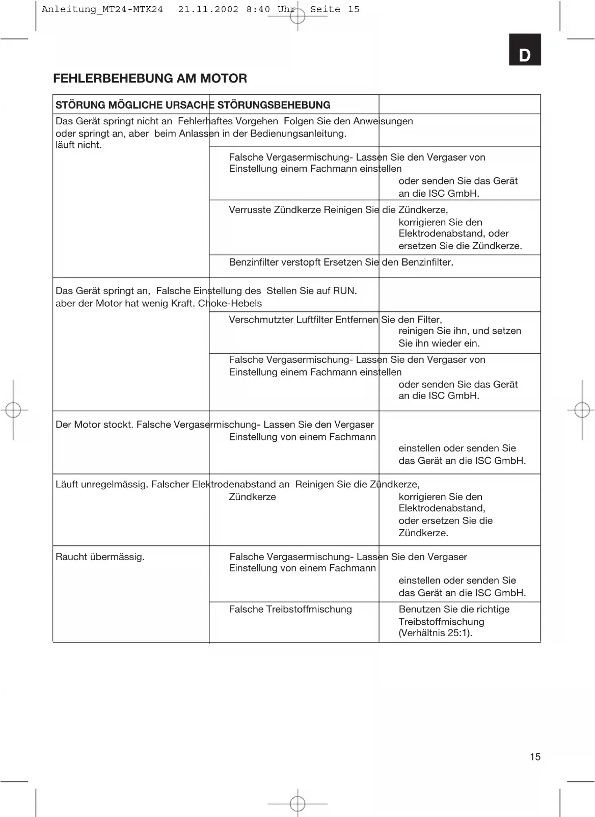 Trouble shooting the engine PROBABLE CAUSE Incorrect starting procedures. Incorrect carburetor mixture adjustment setting. Fouled spark plug Fuel filter plugged. Incorrect lever position on choke. Dirty air filter. Incorrect carburetor mixture adjustment setting. Incorrect carburetor mixture adjustment setting. Incorrectly gapped spark plug. Incorrect carburetor mixture adjustment setting. Incorrect fuel mixture. CORRECTIVE ACTION Follow instructions in the User Manual. Have carburetor adjusted by an Authorized Service Center. Clean / gap or replace plug. Replace fuel filter. Move to RUN position. Remove, clean and reinstall filter. Have carburetor adjusted by an Authorized Service Center. Have carburetor adjusted by an Authorized Service Center. Clean / gap or replace plug. Have carburetor adjusted by an Authorized Service Center. Use properly mixed fuel (25:1 mixture). PROBLEM Unit won’t start or starts but will not run. Unit starts, but engine has low power. Engine hesitates. No power under load. Runs erratically. Smokes excessively. Anleitung_MT24-MTK24 21.11.2002 8:40 Uhr Seite 2223 Sécurité • Utilisation • Entretien MT 24 MTK 24