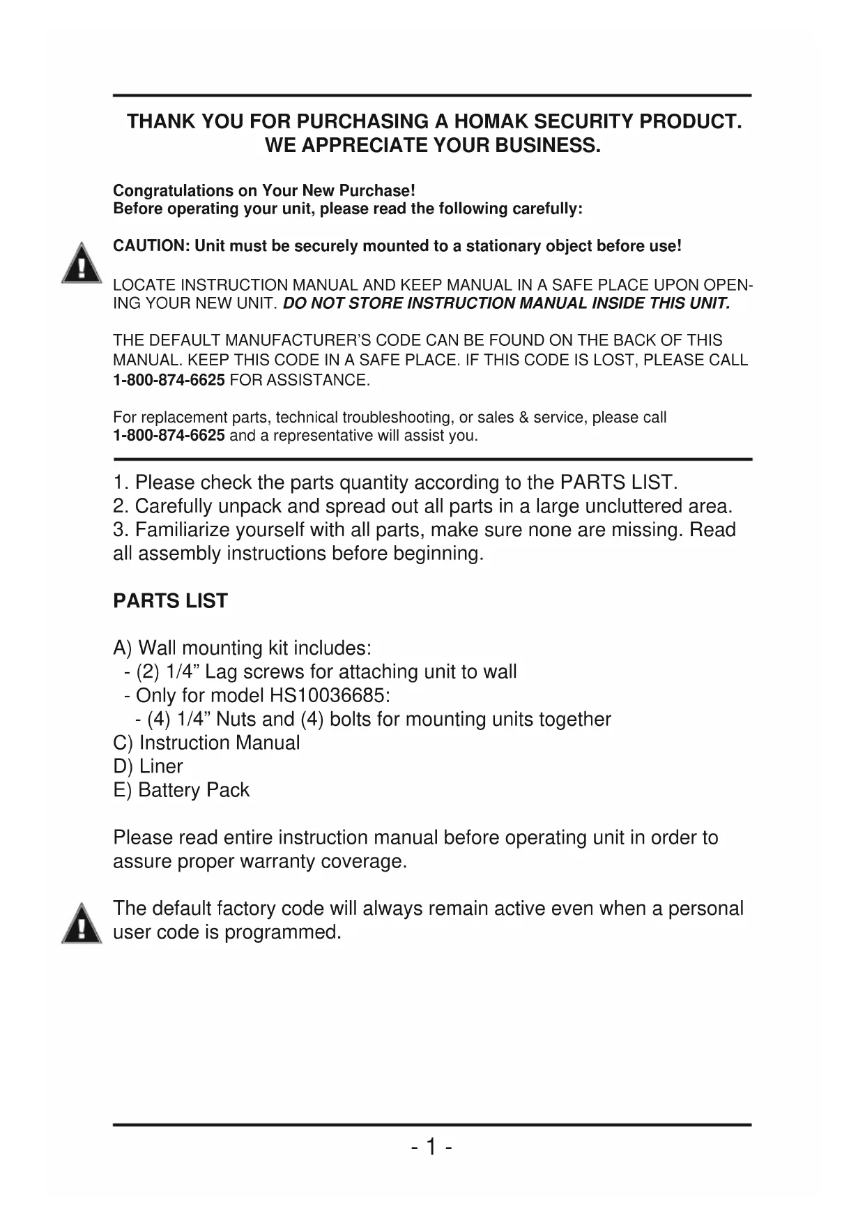 all assembly instructions before beginning. PARTS LIST A) Wall mounting kit includes: - (2) 1/4” Lag screws for attaching unit to wall - Only for model HS10036685: - (4) 1/4” Nuts and (4) bolts for mounting units together C) Instruction Manual D) Liner E) Battery Pack Please read entire instruction manual before operating unit in order to assure proper warranty coverage. The default factory code will always remain active even when a personal user code is programmed.- 2 - Inside this manual you will fi nd: Safety Warnings Before Use Getting Started Programming a User Code Programming a Personal User Code Programming Steps LED Light Indications and Troubleshooting Installing the Unit Battery Backup Warranty Information GETTING STARTED