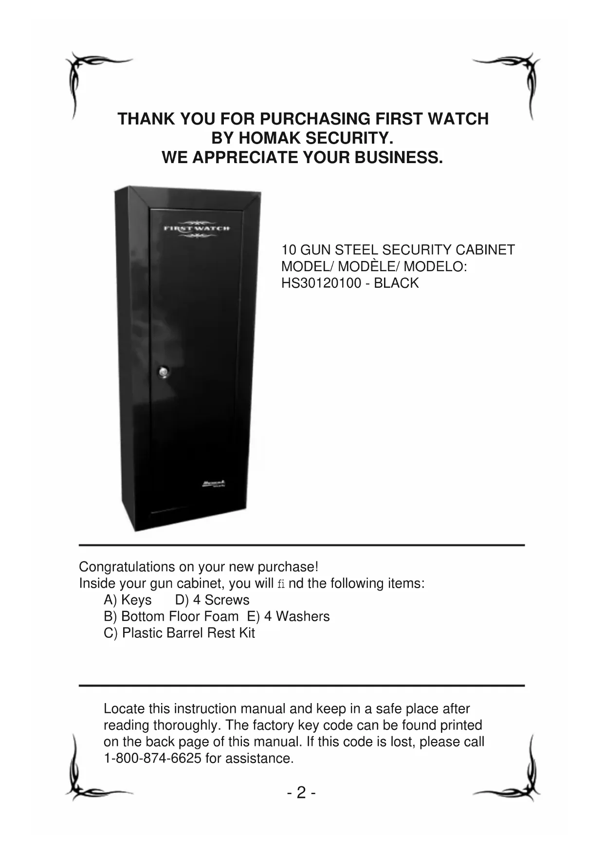 BY HOMAK SECURITY. WE APPRECIATE YOUR BUSINESS. Congratulations on your new purchase! Inside your gun cabinet, you will fi nd the following items: A) Keys D) 4 Screws B) Bottom Floor Foam E) 4 Washers C) Plastic Barrel Rest Kit Locate this instruction manual and keep in a safe place after reading thoroughly. The factory key code can be found printed on the back page of this manual. If this code is lost, please call 1-800-874-6625 for assistance.