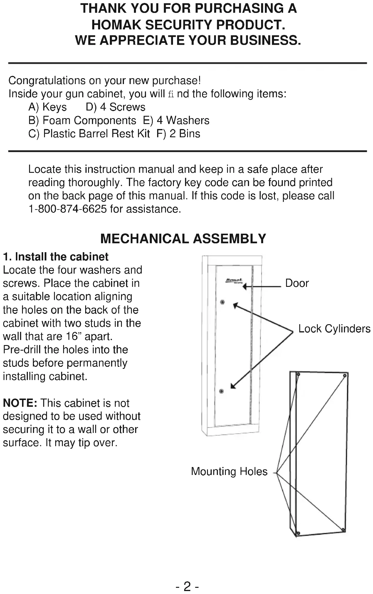 HOMAK SECURITY PRODUCT. WE APPRECIATE YOUR BUSINESS. Congratulations on your new purchase! Inside your gun cabinet, you will fi nd the following items: A) Keys D) 4 Screws B) Foam Components E) 4 Washers C) Plastic Barrel Rest Kit F) 2 Bins Locate this instruction manual and keep in a safe place after reading thoroughly. The factory key code can be found printed on the back page of this manual. If this code is lost, please call 1-800-874-6625 for assistance.